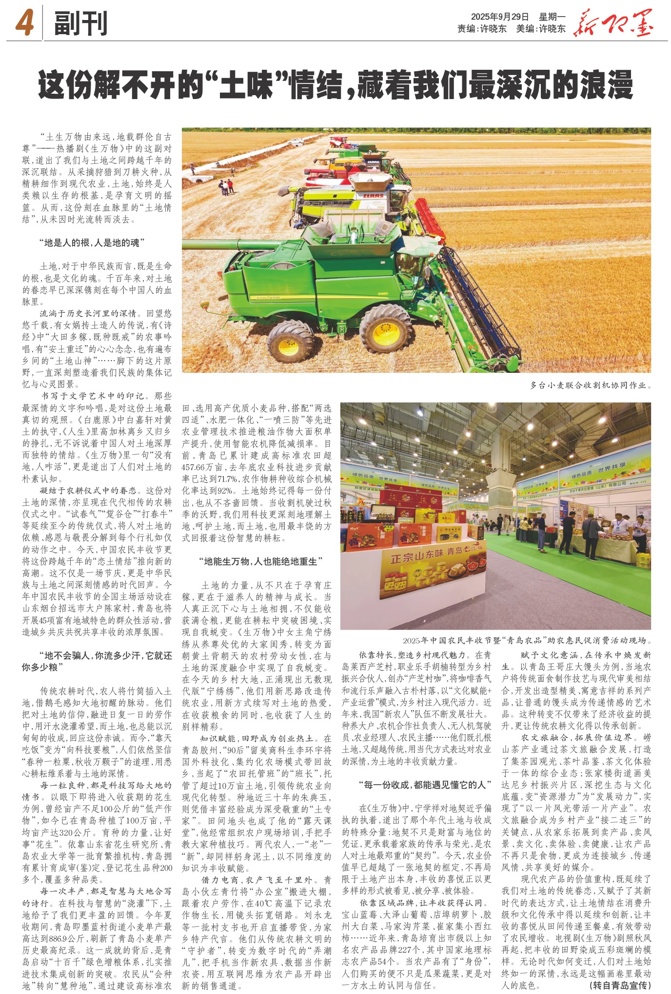 每一次丰产,都是智慧与大地合写的诗行。在科技与智慧的“浇灌”下,土地给予了我们更丰盈的回馈。今年夏收期间,青岛即墨蓝村街道小麦单产最高达到886.9公斤,刷新了青岛小麦单产历史最高纪录。这一成就的背后,是青岛启动“十百千”绿色增粮体系,扎实推进技术集成创新的突破。农民从“会种地”转向“慧种地”,通过建设高标准农田、选用高产优质小麦品种,搭配“两选四适”、水肥一体化、“一喷三防”等先进农业管理技术推进粮油作物大面积单产提升,使用智能农机降低减损率。目前,青岛已累计建成高标准农田超457.66万亩,去年底农业科技进步贡献率已达到71.7%,农作物耕种收综合机械化率达到92%。土地始终记得每一份付出,也从不吝啬回馈。当收割机驶过秋季的沃野,我们用科技更深刻地理解土地、呵护土地,而土地,也用最丰饶的方式回报着这份智慧的耕耘。