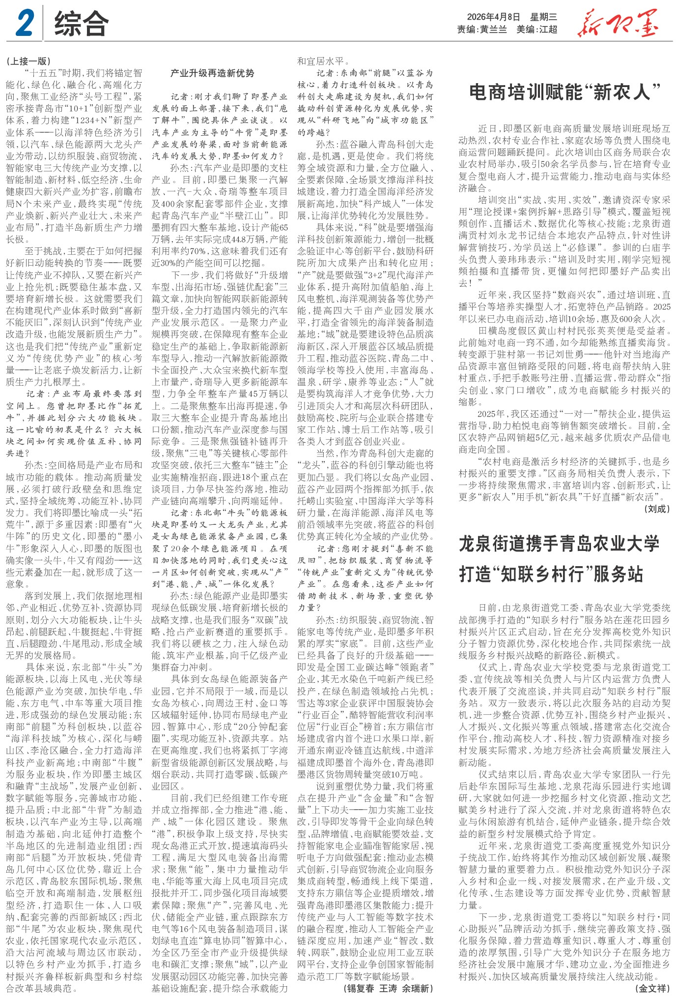 孙杰:纺织服装、商贸物流、智能家电等传统产业,是即墨多年积累的厚实“家底”。目前,这些产业已经具备了良好的升级基础——即发是全国工业碳达峰“领跑者”企业,其无水染色千吨新产线已经投产,在绿色制造领域抢占先机;雪达等3家企业获评中国服装协会“行业百企”,酷特智能营收利润率位居“行业百企”榜首;东方鼎信市场建成省内首个进口水果口岸,新开通东南亚冷链直达航线,中道洋福建成即墨首个海外仓,青岛港即墨港区货物周转量突破10万吨。