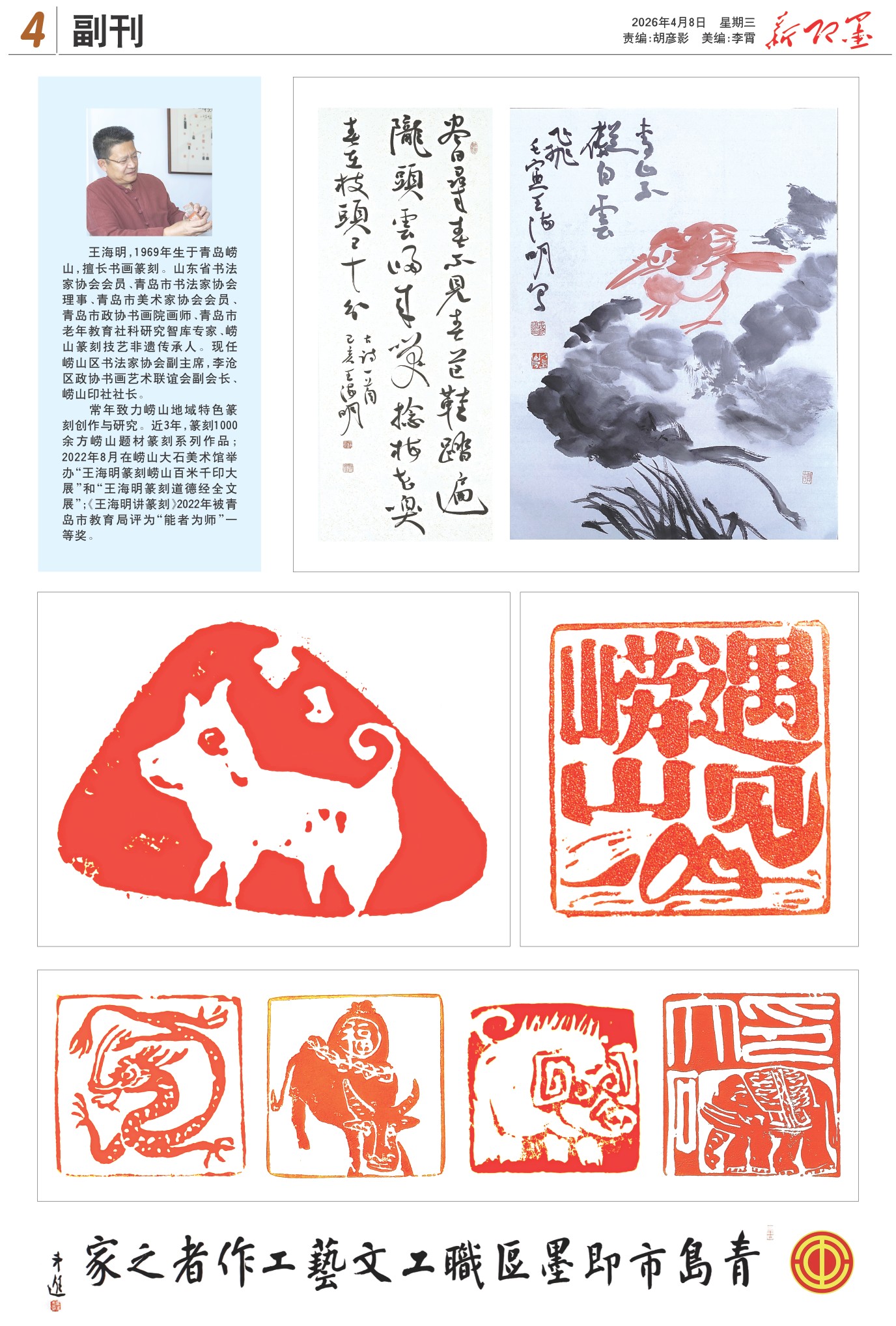 王海明,1969年生于青岛崂山,擅长书画篆刻。山东省书法家协会会员、青岛市书法家协会理事、青岛市美术家协会会员、青岛市政协书画院画师、青岛市老年教育社科研究智库专家、崂山篆刻技艺非遗传承人。现任崂山区书法家协会副主席,李沧区政协书画艺术联谊会副会长、崂山印社社长。
