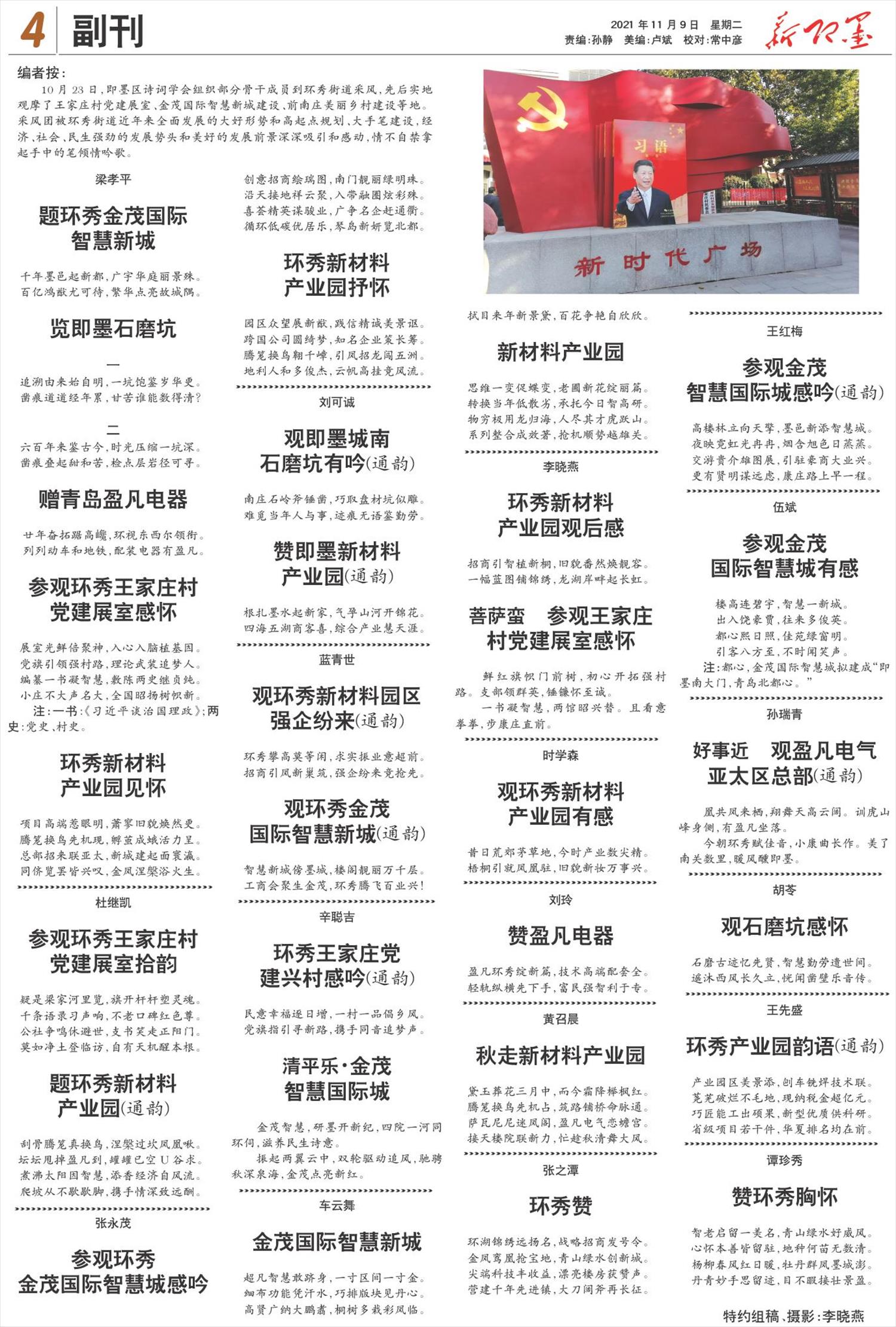 10月23日,即墨区诗词学会组织部分骨干成员到环秀街道采风,先后实地观摩了王家庄村党建展室、金茂国际智慧新城建设、前南庄美丽乡村建设等地。采风团被环秀街道近年来全面发展的大好形势和高起点规划、大手笔建设,经济、社会、民生强劲的发展势头和美好的发展前景深深吸引和感动,情不自禁拿起手中的笔倾情吟歌。