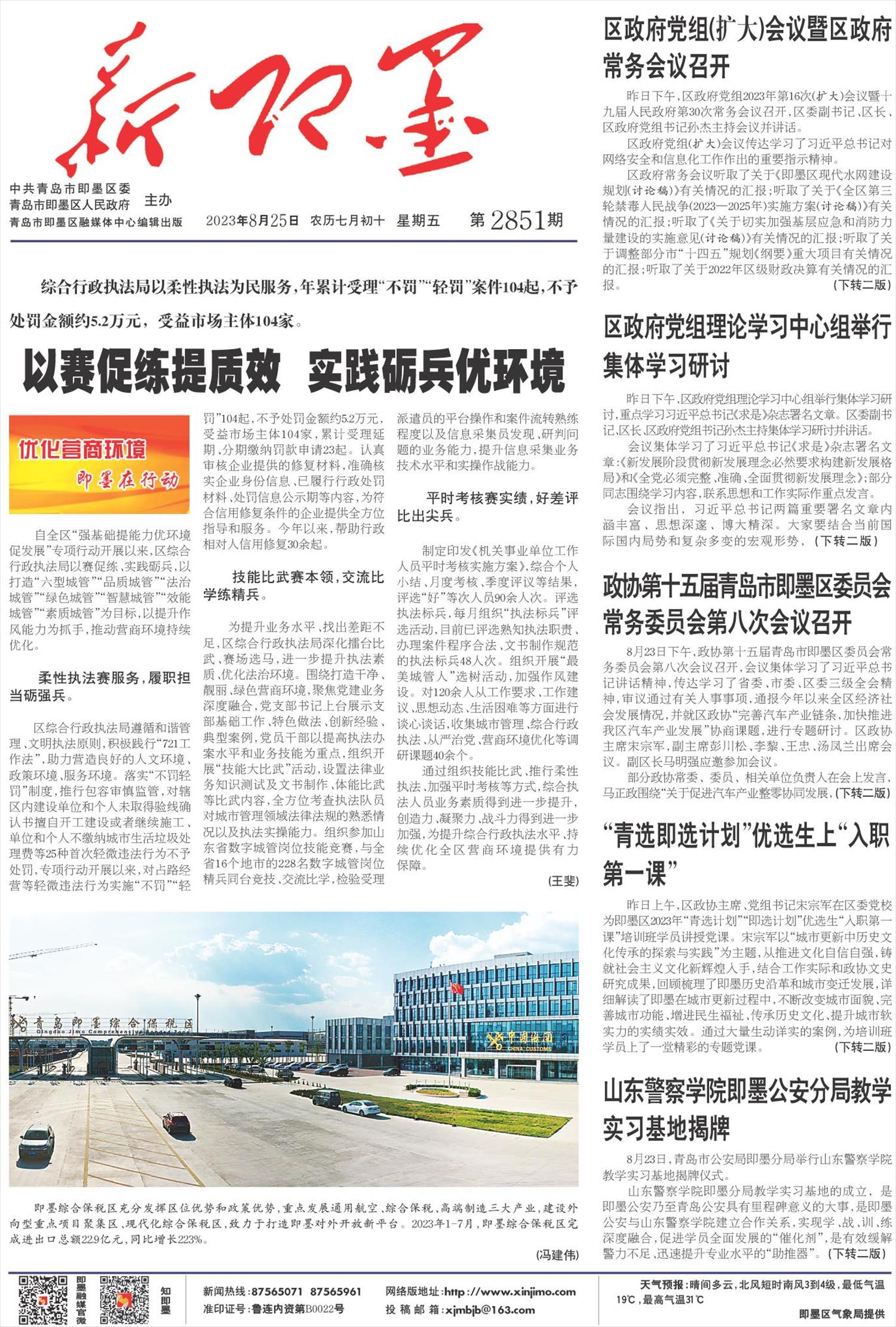 区政府常务会议听取了关于《即墨区现代水网建设规划(讨论稿)》有关情况的汇报;听取了关于《全区第三轮禁毒人民战争(2023—2025年)实施方案(讨论稿)》有关情况的汇报;听取了《关于切实加强基层应急和消防力量建设的实施意见(讨论稿)》有关情况的汇报;听取了关于调整部分市“十四五”规划《纲要》重大项目有关情况的汇报;听取了关于2022年区级财政决算有关情况的汇报。 (下转二版)
