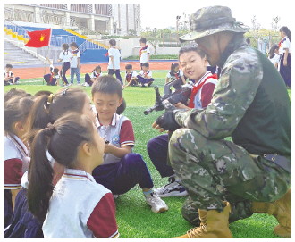 启动仪式上,驻即某部官兵肩扛国旗,带领护旗的同学们迈着铿锵的步伐走向升旗台。伴随着雄壮的国歌,蓝村街道南泉中学1000多名师生齐声高唱国歌,五星红旗冉冉升起,开展了一场别开生面的国防教育课,国防教育的种子深深埋入孩子们心中。