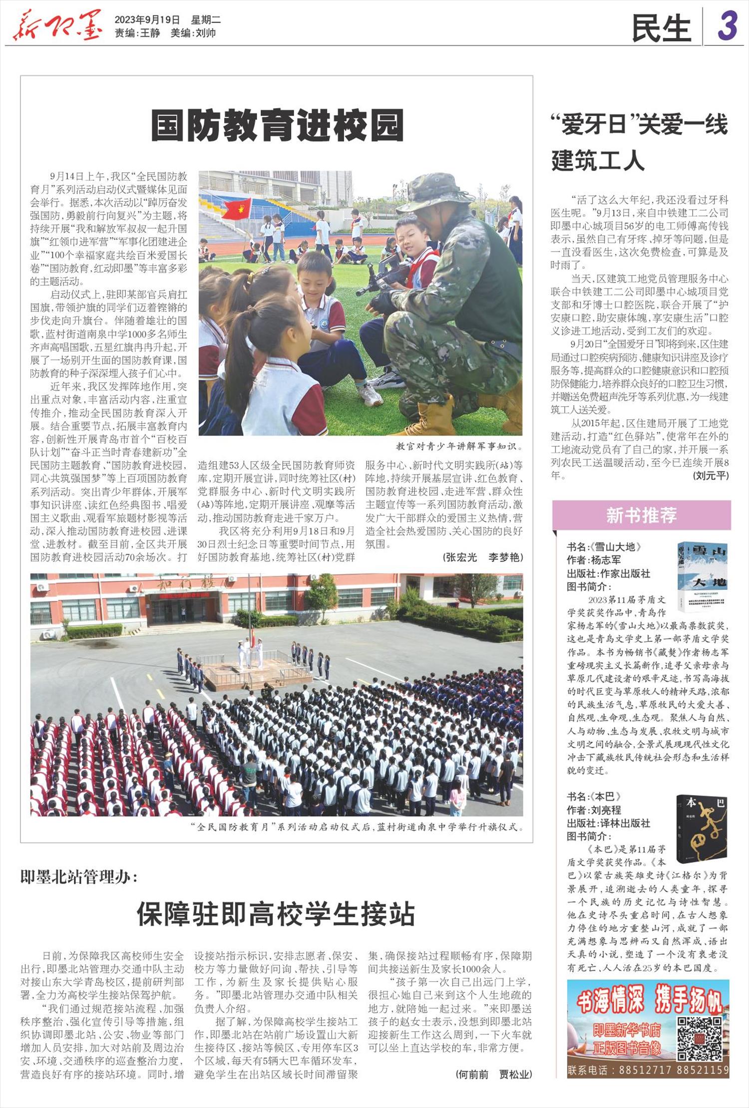 9月14日上午,我区“全民国防教育月”系列活动启动仪式暨媒体见面会举行。据悉,本次活动以“踔厉奋发强国防,勇毅前行向复兴”为主题,将持续开展“我和解放军叔叔一起升国旗”“红领巾进军营”“军事化团建进企业”“100个幸福家庭共绘百米爱国长卷”“国防教育,红动即墨”等丰富多彩的主题活动。