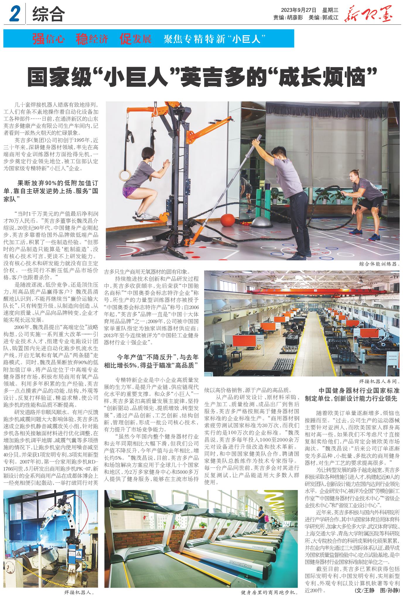 从产品的研发设计、原材料采购、生产加工、质量检测、成品出厂到售后服务,英吉多严格按照高于健身器材国家标准的企业标准生产。“商用器材钢索疲劳测试国家标准为30万次,而我们实行的是100万次的企业标准。”魏茂昌说,英吉多每年投入1000至2000余万元对设备进行升级改造和技术革新。同时,和中国国家健美队合作,聘请国家健美队总教练作为技术专家指导。每一台产品问世前,英吉多会对其进行反复测试,让产品能适用大多数人群使用。