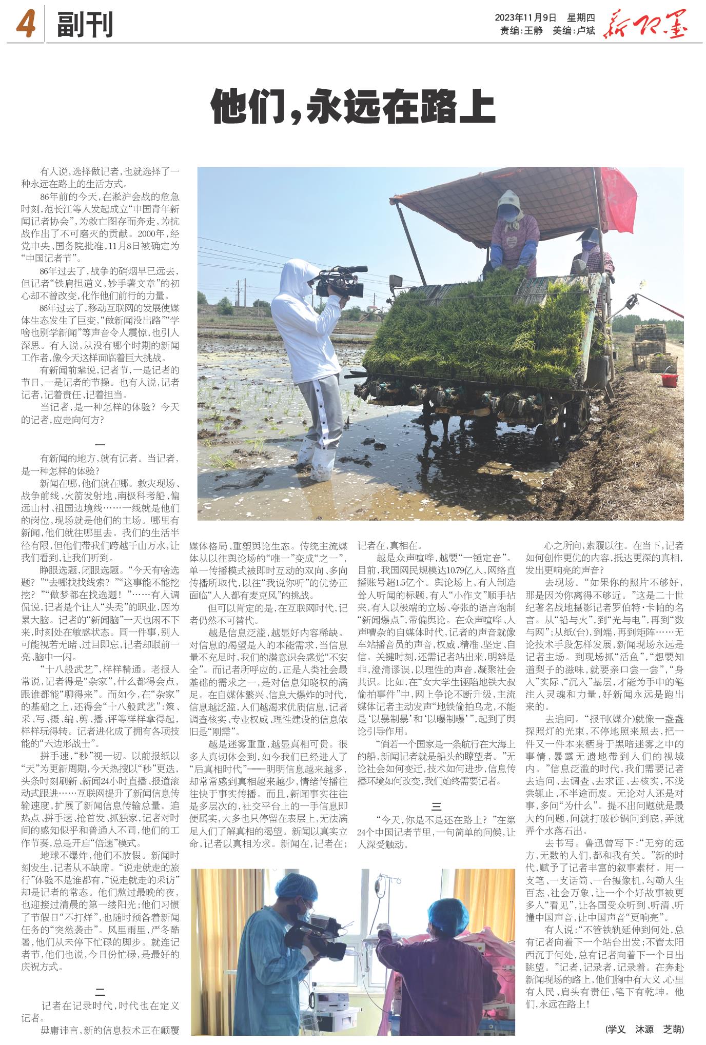 有人说:“不管铁轨延伸到何处,总有记者向着下一个站台出发;不管太阳西沉于何处,总有记者向着下一个日出眺望。”记者,记录者,记录着。在奔赴新闻现场的路上,他们胸中有大义、心里有人民、肩头有责任、笔下有乾坤。他们,永远在路上!