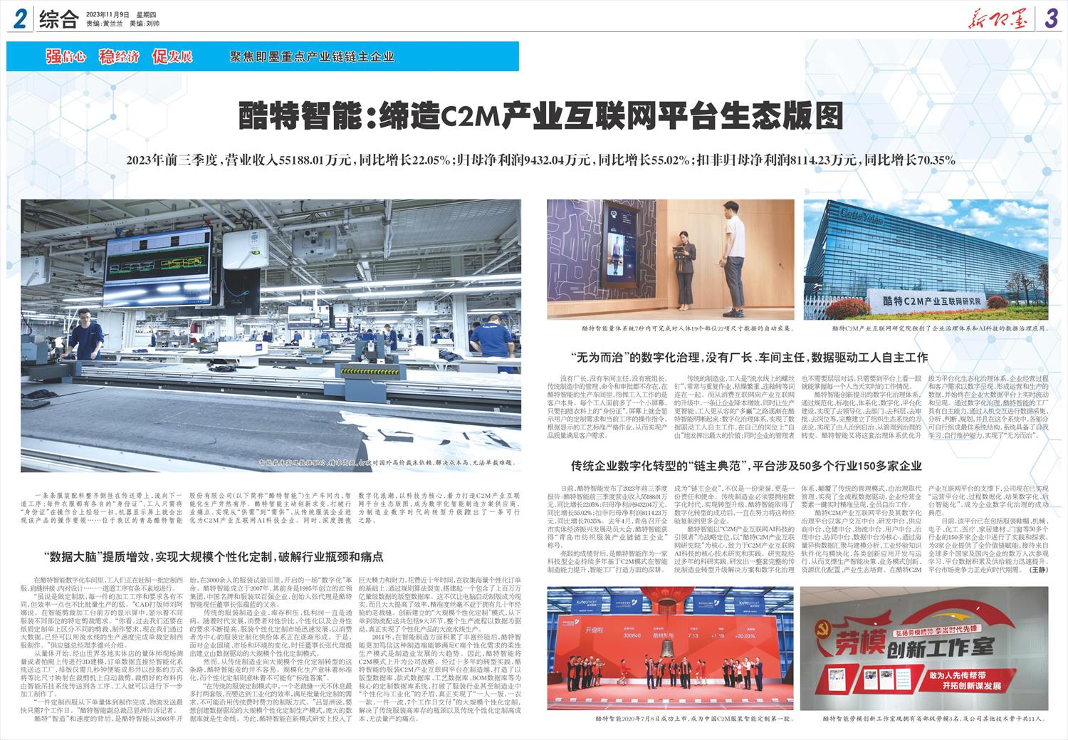 酷特智能:缔造C2M产业互联网平台生态版图 2023年前三季度,营业收入55188.01万元,同比增长22.05%;归母净利润9432.04万元,同比增长55.02%;扣非归母净利润8114.23万元,同比增长70.35%   一条条服装配料整齐倒挂在传送带上,流向下一道工序;每件衣服都有各自的“身份证”,工人只需将“身份证”在操作台上轻轻一扫,机器显示屏上就会出现该产品的操作要领……位于我区的青岛酷特智能股份有限公司(以下简称“酷特智能”)生产车间内,智能化生产井然有序。酷特智能主动创新求变,打破行业痛点,实现从“供需”到“需供”、从传统服装企业进化为C2M产业互联网AI科技企业。同时,深度拥抱数字化浪潮,以科技为核心,着力打造C2M产业互联网平台生态版图,成为数字化智能制造方案供应商,为制造业数字时代的转型升级蹚出了一条可行之路。