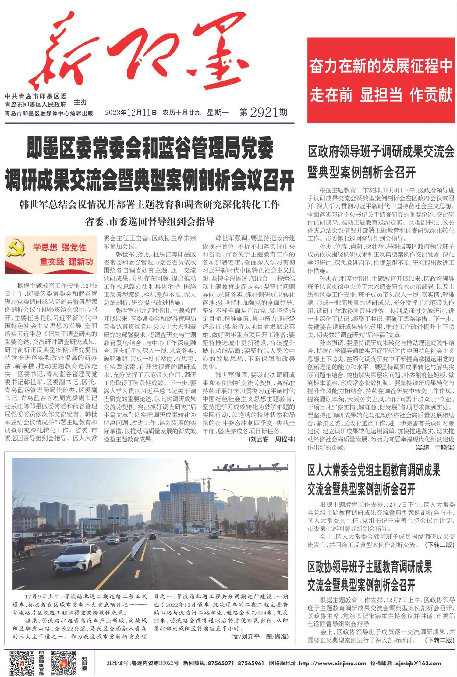 即墨区委常委会和蓝谷管理局党委调研成果交流会暨典型案例剖析会议召开 韩世军总结会议情况并部署主题教育和调查研究深化转化工作省委、市委巡回督导组到会指导   根据主题教育工作安排,12月8日上午,即墨区委常委会和蓝谷管理局党委调研成果交流会暨典型案例剖析会议在即墨宾馆会议中心召开,主要任务是以习近平新时代中国特色社会主义思想为指导,全面落实习近平总书记关于调查研究的重要论述,交流研讨调查研究成果,研讨剖析正反典型案例,研究提出持续推进落实和改进提高的新办法、新举措,推动主题教育走深走实。区委书记,青岛蓝谷管理局党委书记韩世军,区委副书记、区长,青岛蓝谷管理局局长孙杰,区委副书记,青岛蓝谷管理局党委副书记杜乐江等即墨区委常委和蓝谷管理局党委委员依次作交流发言。韩世军总结会议情况并部署主题教育和调查研究深化转化工作。省委、市委巡回督导组到会指导。区人大常委会主任王宝善,区政协主席宋宗军参加会议。