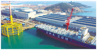1月10日,记者在青岛造船厂有限公司看到,一艘新一代宽体灵便型集装箱船刚刚完成命名,即将交付。该船型是造船厂新年首船,也是山东省目前在建载箱量最多的集装箱船。