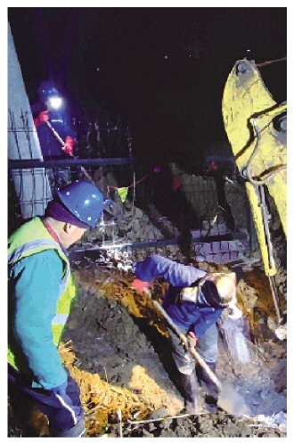 当晚7时许,抢修机械和人员全部到位,伴随着机器的轰鸣声,管道抢修正式开始。路面开挖后工作人员发现,由于管道破损较严重,无法直接使用哈夫节进行维修,需将6米长的PVC管道全部挖出来后,再重新安装新的管道。作业现场周围一片漆黑,只能靠着应急灯照亮,冒着零下四五度的低温,抢修人员争分夺秒地开展抢修。由于管道破损位置位于排水沟底,土质十分松软,挖掘机要站稳进行施工着实有点困难,施工人员只好跳进冰冷的泥浆里,借着头灯和应急照明灯的灯光,一锹一锹地挖出了一个长10米、宽4米、深1.5米的工作坑。深夜11时许,大雾弥漫、寒气逼人,汗水和冰水交织在维修人员的脸上,他们顾不上擦,加紧时间奋力抢修。1月13日凌晨2时30分,供水管道修复完毕,冲洗完管道、回填工作坑后已是凌晨4时。