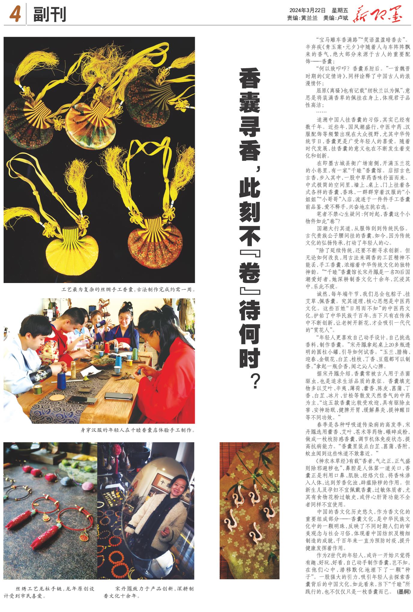 作为Z世代的年轻人,或许一开始只觉得有趣、好玩、好看,自己动手制作香囊,岂不知,在他们心中,潜移默化地埋下了一颗“种子”。一股强大的引力,吸引年轻人去探索香囊背后的中国文化,如此看来,当下“千睦”所践行的,也不仅仅只是一枚香囊而已。 (墨舸)