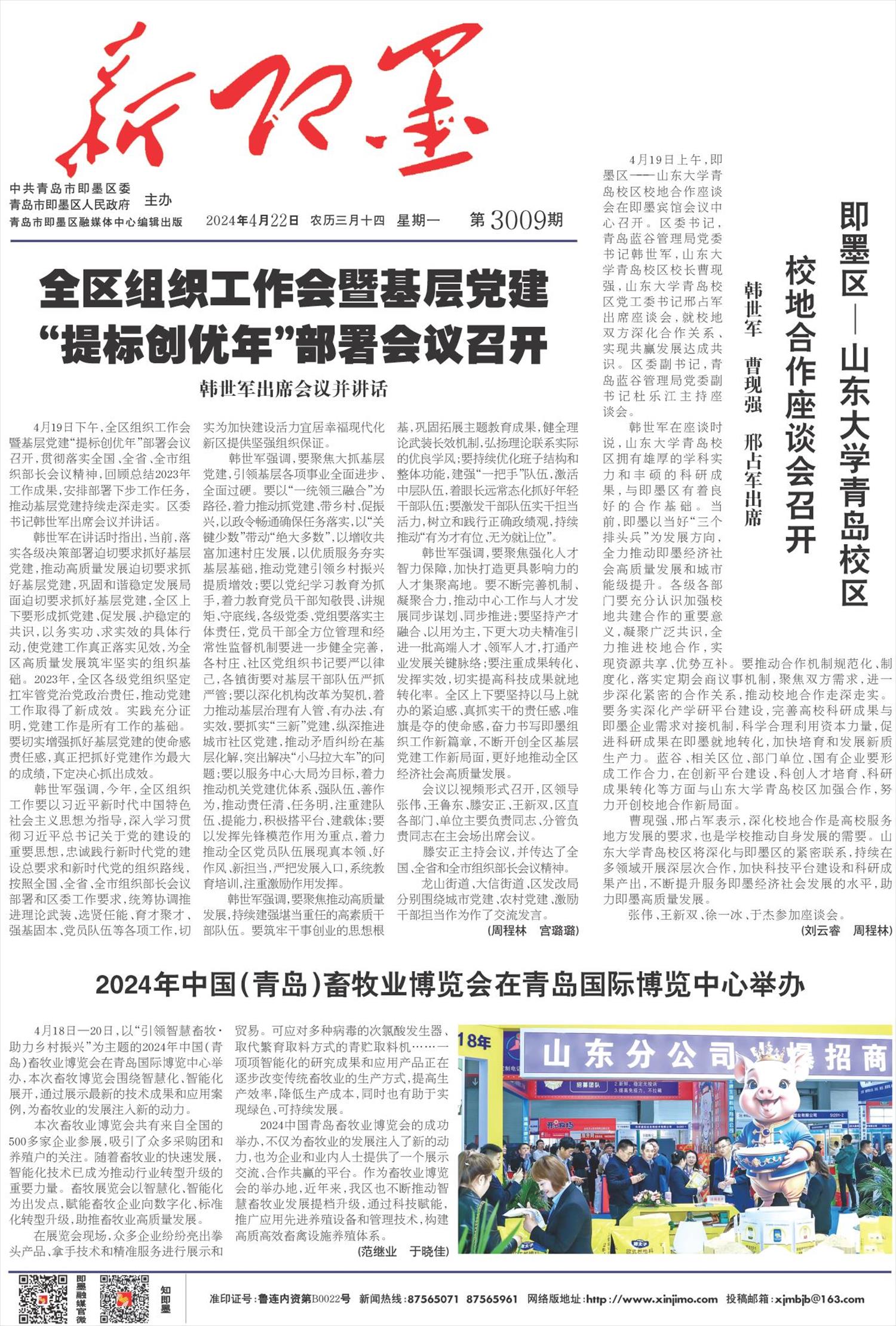 韩世军强调,要聚焦强化人才智力保障,加快打造更具影响力的人才集聚高地。要不断完善机制、凝聚合力,推动中心工作与人才发展同步谋划、同步推进;要坚持产才融合、以用为主,下更大功夫精准引进一批高端人才、领军人才,打通产业发展关键脉络;要注重成果转化、发挥实效,切实提高科技成果就地转化率。全区上下要坚持以马上就办的紧迫感、真抓实干的责任感、唯旗是夺的使命感,奋力书写即墨组织工作新篇章,不断开创全区基层党建工作新局面,更好地推动全区经济社会高质量发展。
