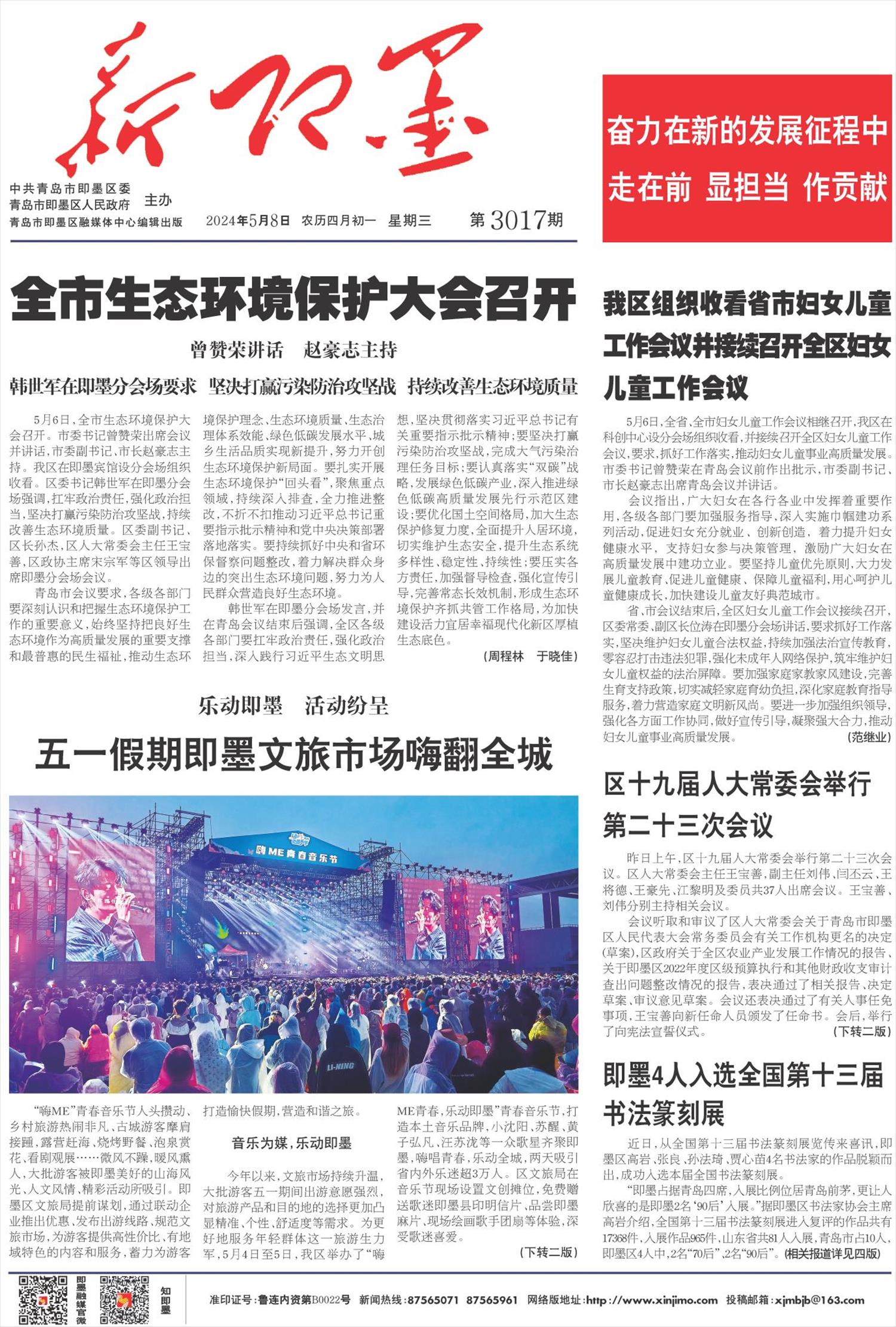 5月6日,全市生态环境保护大会召开。市委书记曾赞荣出席会议并讲话,市委副书记、市长赵豪志主持。我区在即墨宾馆设分会场组织收看。区委书记韩世军在即墨分会场强调,扛牢政治责任,强化政治担当,坚决打赢污染防治攻坚战,持续改善生态环境质量。区委副书记、区长孙杰,区人大常委会主任王宝善,区政协主席宋宗军等区领导出席即墨分会场会议。