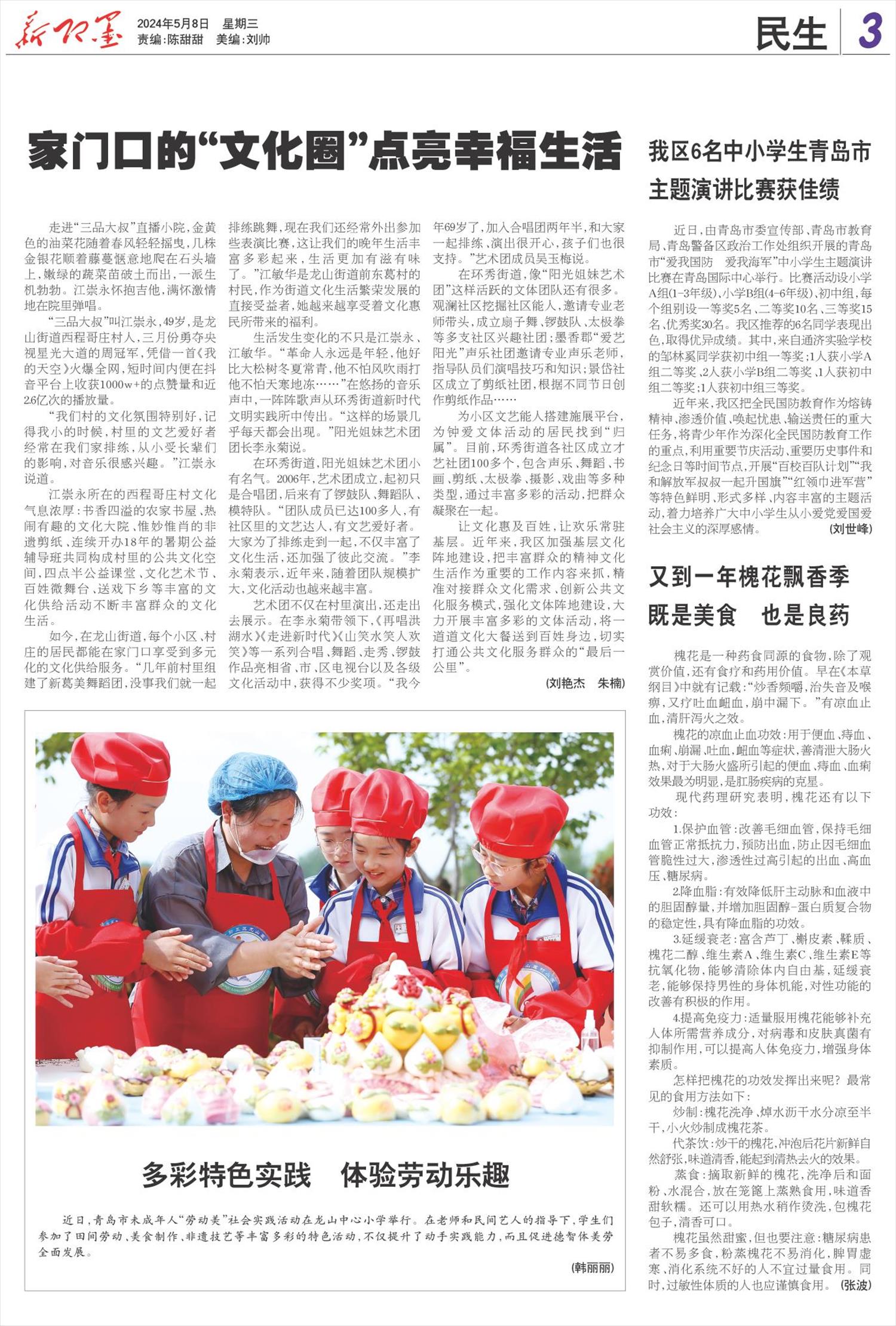 近日,青岛市未成年人“劳动美”社会实践活动在龙山中心小学举行。在老师和民间艺人的指导下,学生们参加了田间劳动、美食制作、非遗技艺等丰富多彩的特色活动,不仅提升了动手实践能力,而且促进德智体美劳全面发展。