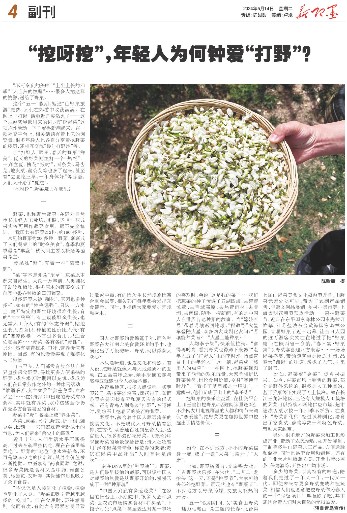 “不仅仅是人类驯化了植物,植物也驯化了人类。”野菜正吸引着越来越多的“吃货”。但在食用时,要注意辨别,食而有度,有的含有毒素容易导致过敏或中毒,有的因为生长环境原因富含重金属等,相关部门每年都会发出采食警示。同时,也提醒大家要爱护环境和树木。
