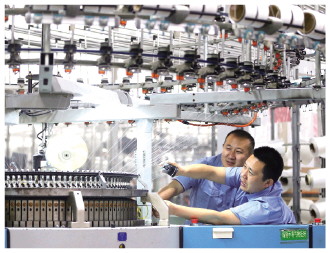 图为全国纺织大工匠姜正涛(右)和同事在机台上交流纬编工艺技术。