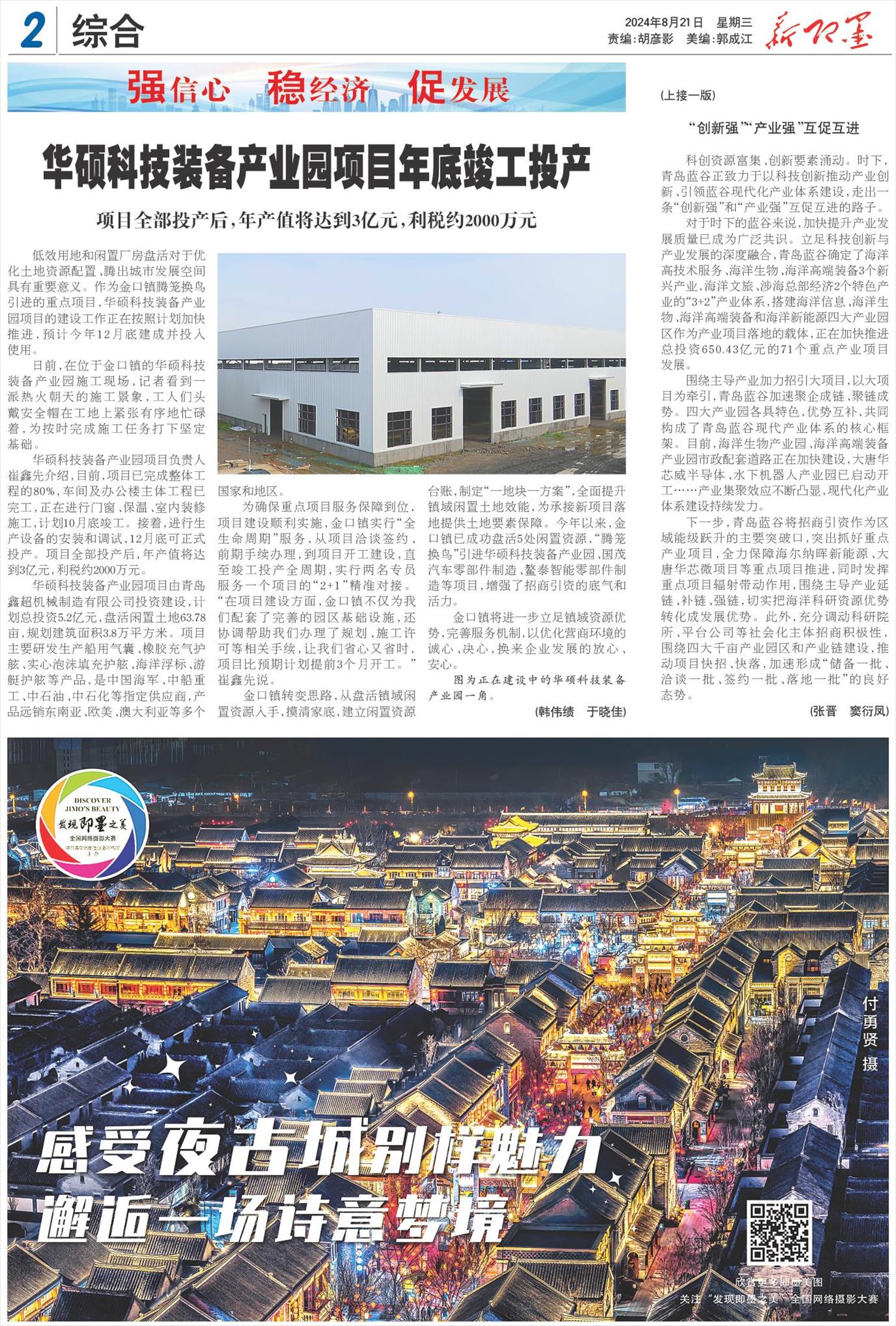华硕科技装备产业园项目由青岛鑫超机械制造有限公司投资建设,计划总投资5.2亿元,盘活闲置土地63.78亩,规划建筑面积3.8万平方米。项目主要研发生产船用气囊、橡胶充气护舷、实心泡沫填充护舷、海洋浮标、游艇护舷等产品,是中国海军、中船重工、中石油、中石化等指定供应商,产品远销东南亚、欧美、澳大利亚等多个国家和地区。