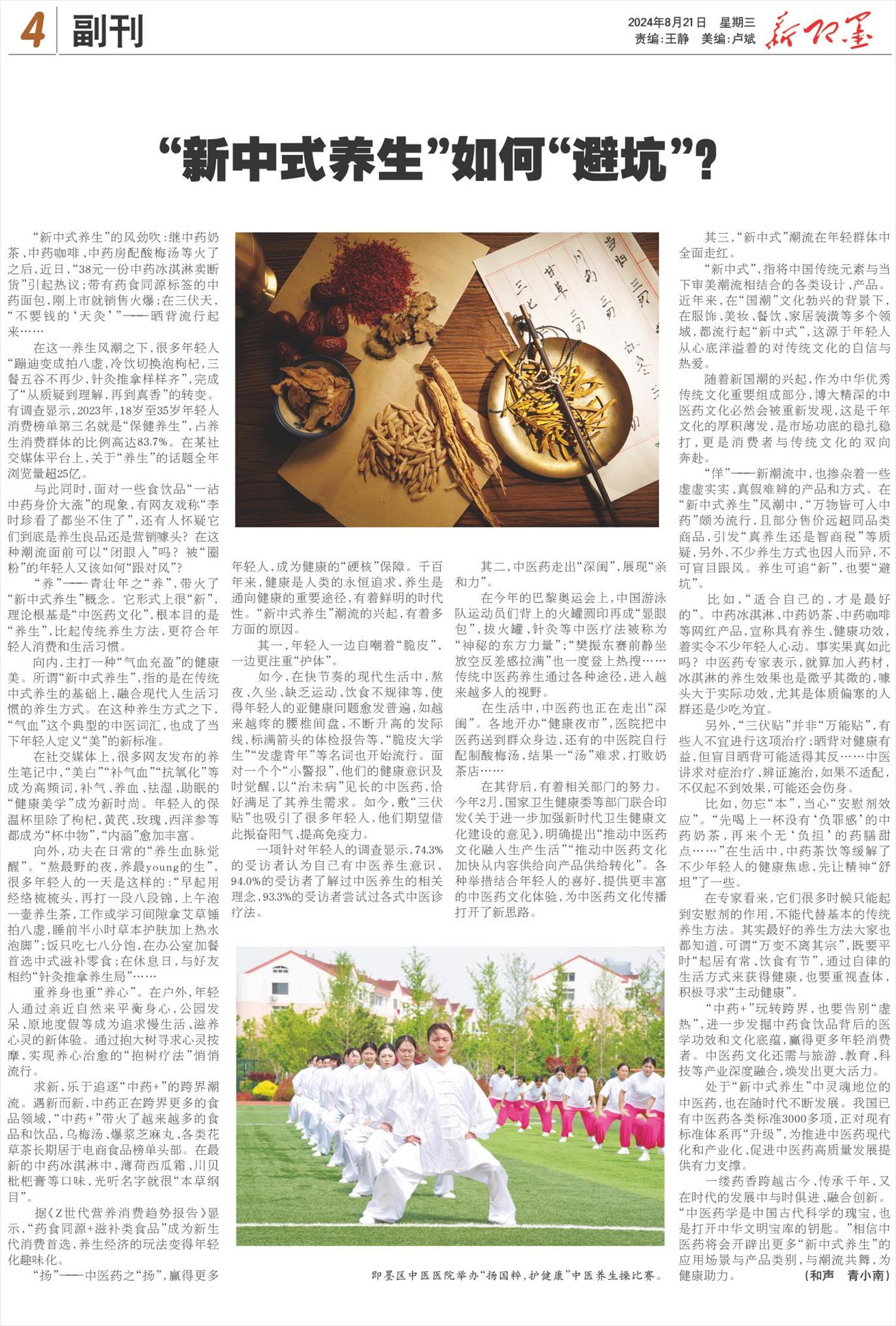 “扬”——中医药之“扬”,赢得更多年轻人,成为健康的“硬核”保障。千百年来,健康是人类的永恒追求,养生是通向健康的重要途径,有着鲜明的时代性。“新中式养生”潮流的兴起,有着多方面的原因。