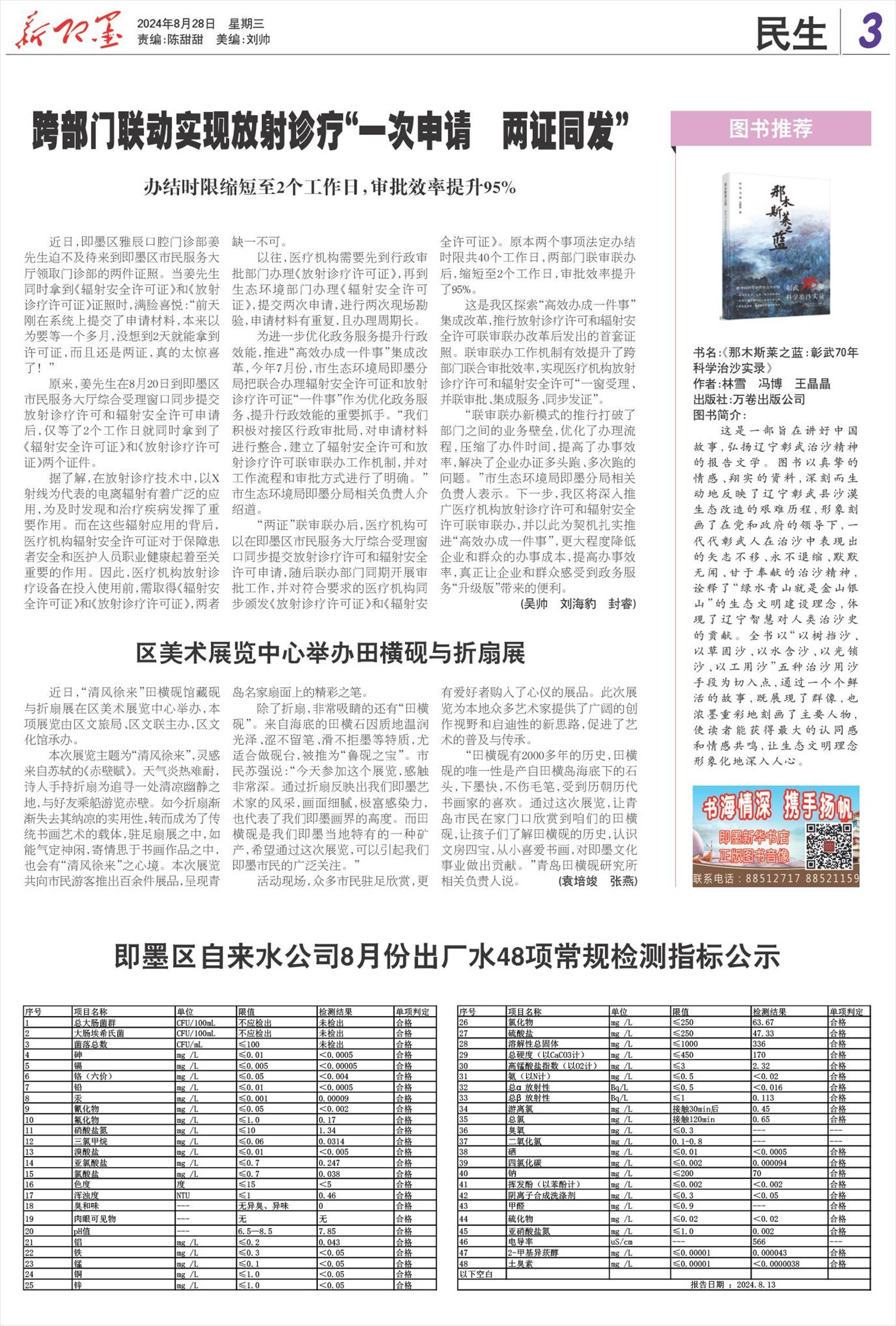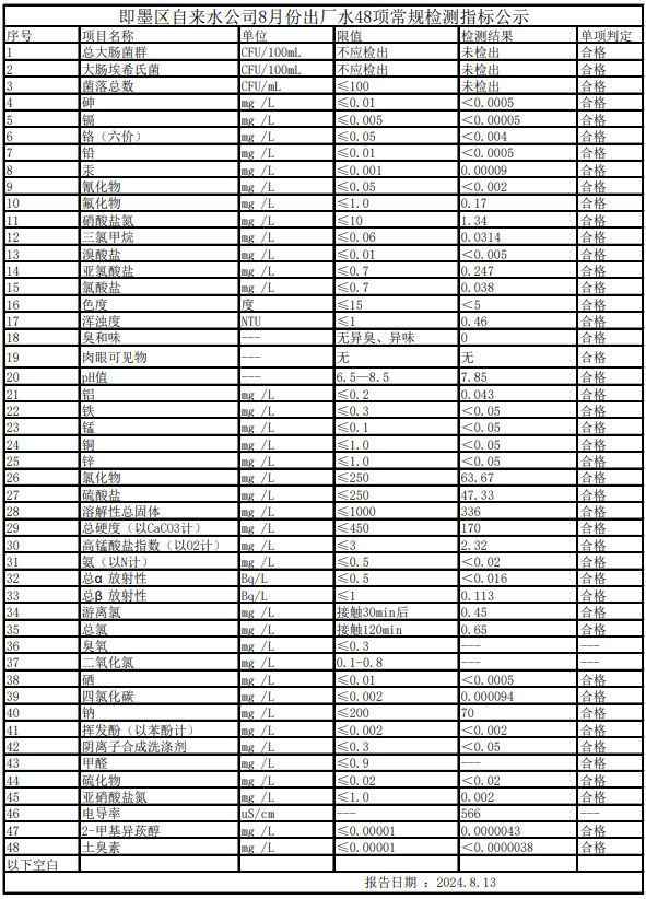 即墨区自来水公司8月份出厂水48项常规检测指标公示