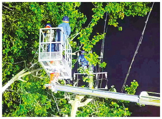 下图:电力工人在暴雨中抢修线路。