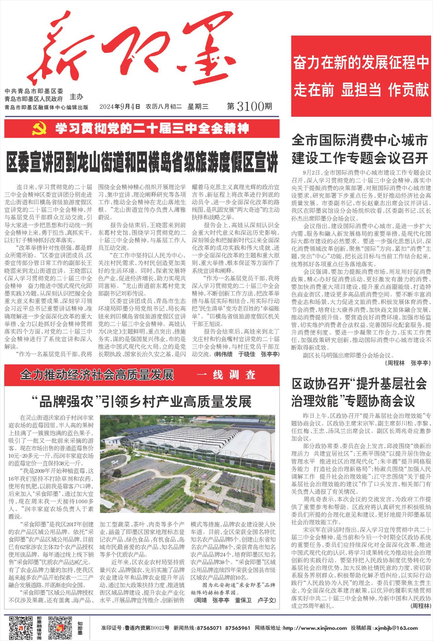 全市国际消费中心城市建设工作专题会议召开   9月2日,全市国际消费中心城市建设工作专题会议召开,深入学习贯彻党的二十届三中全会精神,落实中央关于提振消费的决策部署,对照国际消费中心城市建设要求,研究部署下步重点任务,更好推动经济社会高质量发展。市委副书记、市长赵豪志出席会议并讲话。我区在即墨宾馆设分会场组织收看,区委副书记、区长孙杰出席即墨分会场会议。