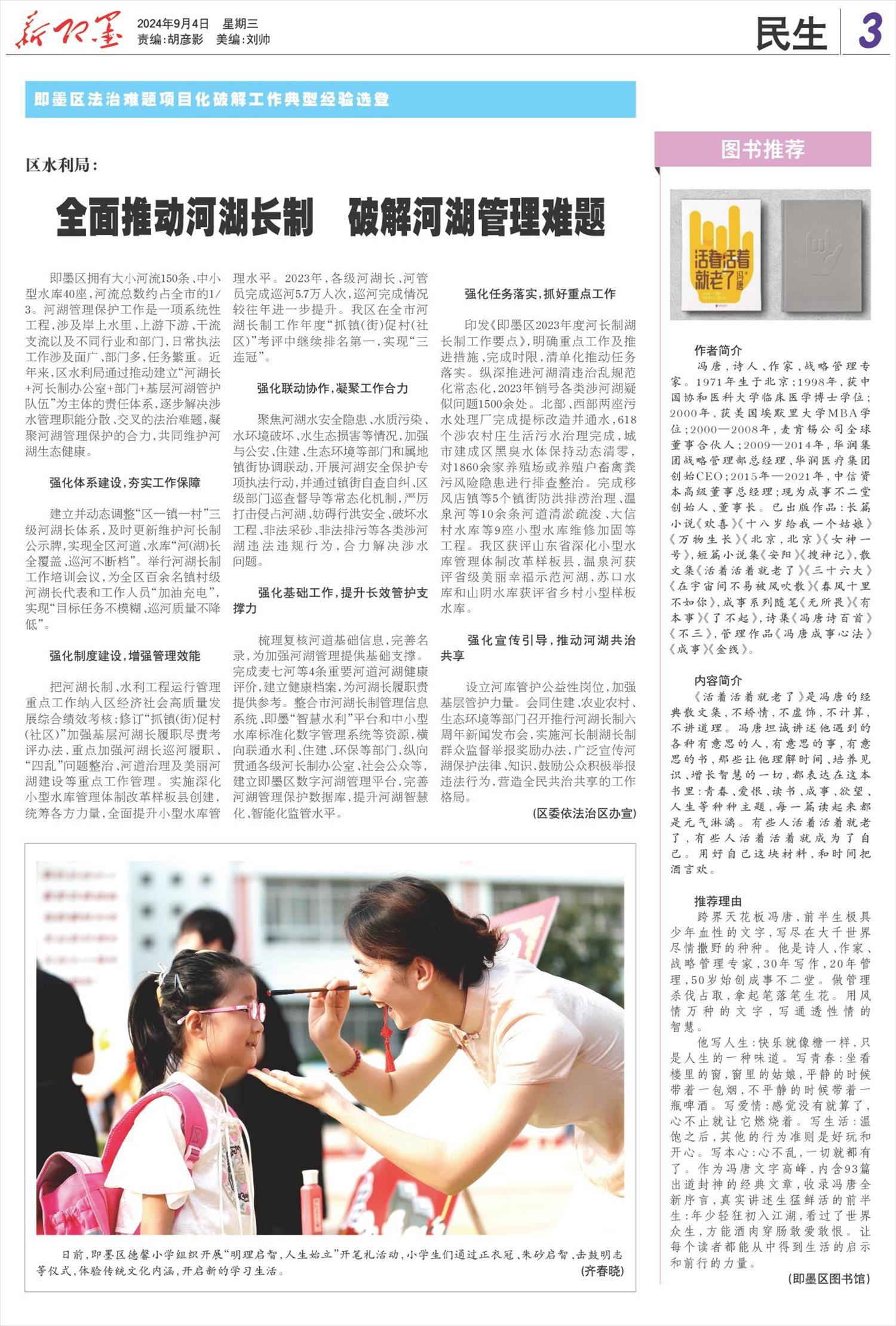 印发《即墨区2023年度河长制湖长制工作要点》,明确重点工作及推进措施、完成时限,清单化推动任务落实。纵深推进河湖清违治乱规范化常态化,2023年销号各类涉河湖疑似问题1500余处。北部、西部两座污水处理厂完成提标改造并通水,618个涉农村庄生活污水治理完成,城市建成区黑臭水体保持动态清零,对1860余家养殖场或养殖户畜禽粪污风险隐患进行排查整治。完成移风店镇等5个镇街防洪排涝治理、温泉河等10余条河道清淤疏浚、大信村水库等9座小型水库维修加固等工程。我区获评山东省深化小型水库管理体制改革样板县,温泉河获评省级美丽幸福示范河湖,苏口水库和山阴水库获评省乡村小型样板水库。