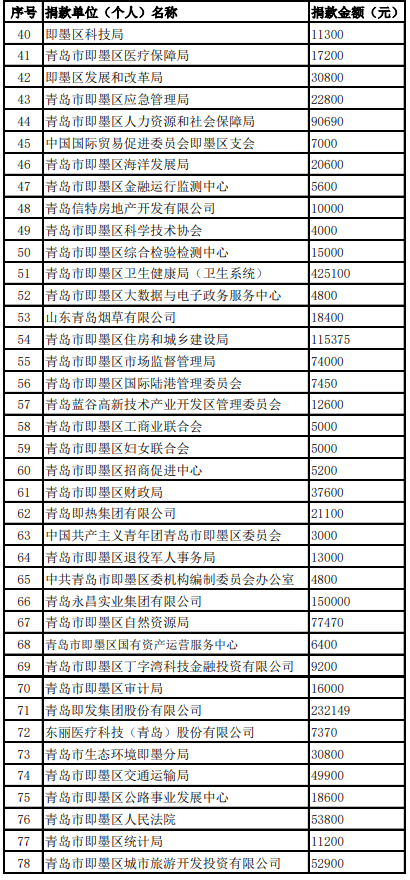 根据《中共青岛市即墨区委宣传部等七部门关于开展2024年青岛市即墨区“慈善一日捐”活动的通知》要求,即墨区慈善总会于2024年6月20日启动“慈善一日捐”专项募捐活动。依据《中华人民共和国慈善法》及民政部相关规定要求,此募捐方案已在民政部指定平台——慈善中国进行备案,公开募捐备案号为:51370282MJD9843218A24001。截至2024年9月25日,累计接收机关事业单位、镇(街道)工作人员和爱心企业、爱心人士捐款5924480.5元,现将捐款情况公示如下:   如有遗漏、错误,请及时与即墨区慈善总会联系,联系电话:0532-88533399。
