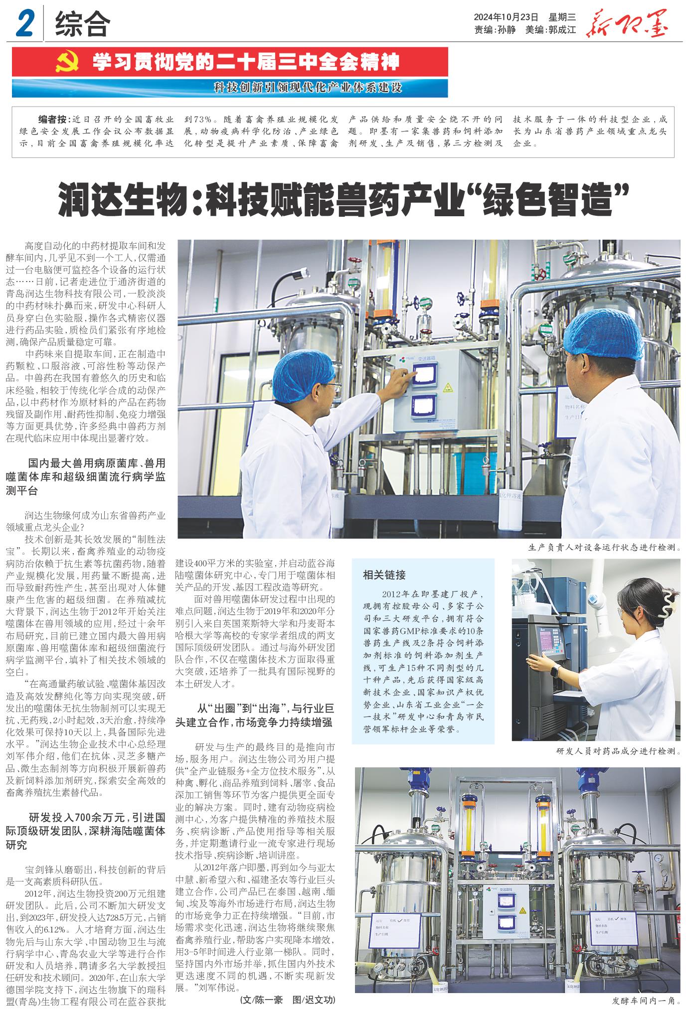 编者按:近日召开的全国畜牧业绿色安全发展工作会议公布数据显示,目前全国畜禽养殖规模化率达到73%。随着畜禽养殖业规模化发展,动物疫病科学化防治、产业绿色化转型是提升产业素质、保障畜禽产品供给和质量安全绕不开的问题。即墨有一家集兽药和饲料添加剂研发、生产及销售,第三方检测及技术服务于一体的科技型企业,成长为山东省兽药产业领域重点龙头企业。