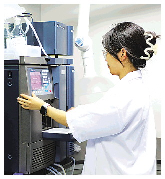 研发人员对药品成分进行检测。