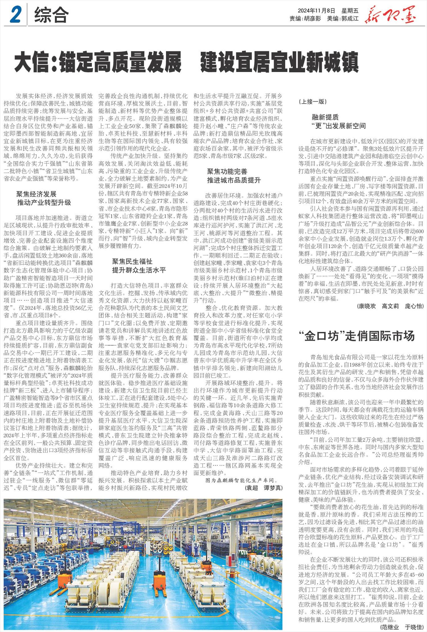 大信:锚定高质量发展 建设宜居宜业新城镇   发展实体经济,经济发展质效持续优化;保障改善民生,城镇功能品质持续完善;统筹发展与安全,基层治理水平持续提升……大信街道结合自身区位优势和产业基础,锚定即墨西部智能制造新高地、宜居宜业新城镇目标,在更为注重经济发展和民生改善同频共振相关领域,绵绵用力,久久为功,先后获得“全国综合实力千强镇”“山东省第二批特色小镇”“省卫生城镇”“山东省农业产业强镇”等荣誉称号。