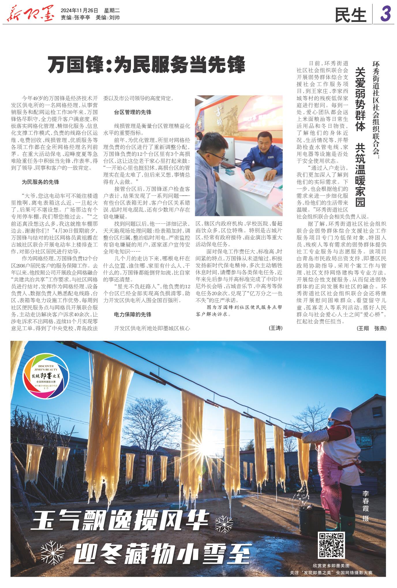 作为网格经理,万国锋负责12个台区2936户居民客户的服务保障工作。去年以来,他按照公司开展政企网格融合“共建共治共享”工作要求,与社区网格员进行结对,发挥作为网格经理、设备负责人、数据负责人熟悉配电线路、台区、表箱等电力设施工作优势,每周到社区便民服务点与网格员开展联合服务,主动走访解决客户诉求40余次,让涉电诉求不出网格,连续11个月实现零意见工单,得到了中央党校、青岛政法委以及市公司领导的高度肯定。