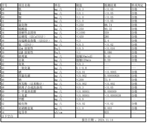 即墨区自来水公司11月份出厂水54项常规检测指标公示