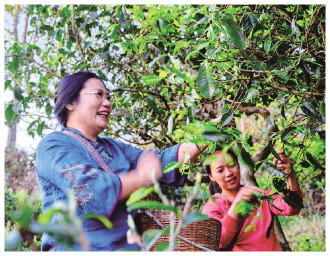 “皎然”云南省临沧市茶叶种植基地,姜秀云和茶农一起采茶。