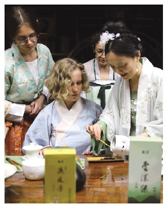 外国友人在皎然茶馆体验中国茶艺文化。