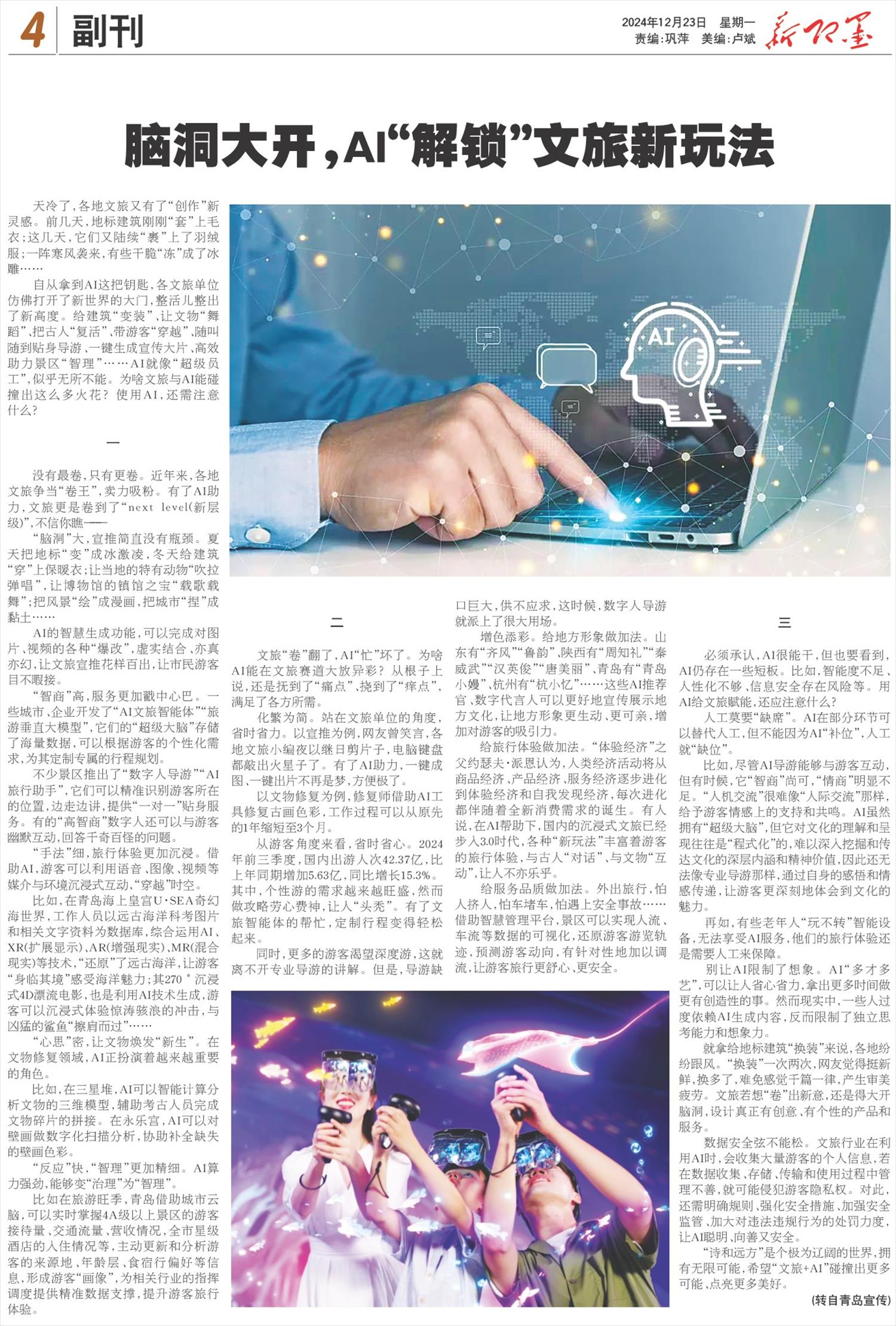 增色添彩。给地方形象做加法。山东有“齐风”“鲁韵”、陕西有“周知礼”“秦威武”“汉英俊”“唐美丽”、青岛有“青岛小嫚”、杭州有“杭小忆”……这些AI推荐官、数字代言人可以更好地宣传展示地方文化,让地方形象更生动、更可亲,增加对游客的吸引力。