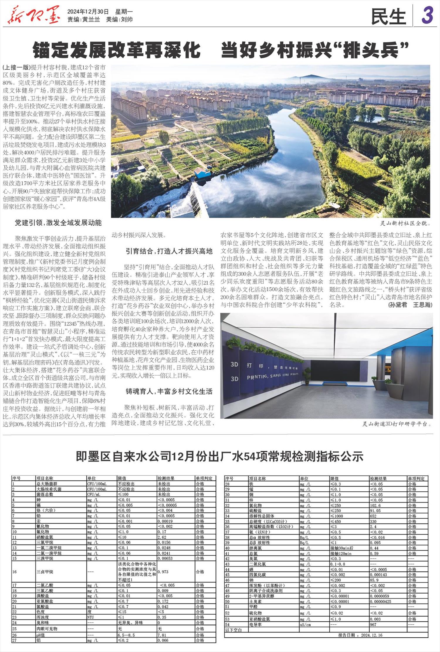 即墨区自来水公司12月份出厂水54项常规检测指标公示