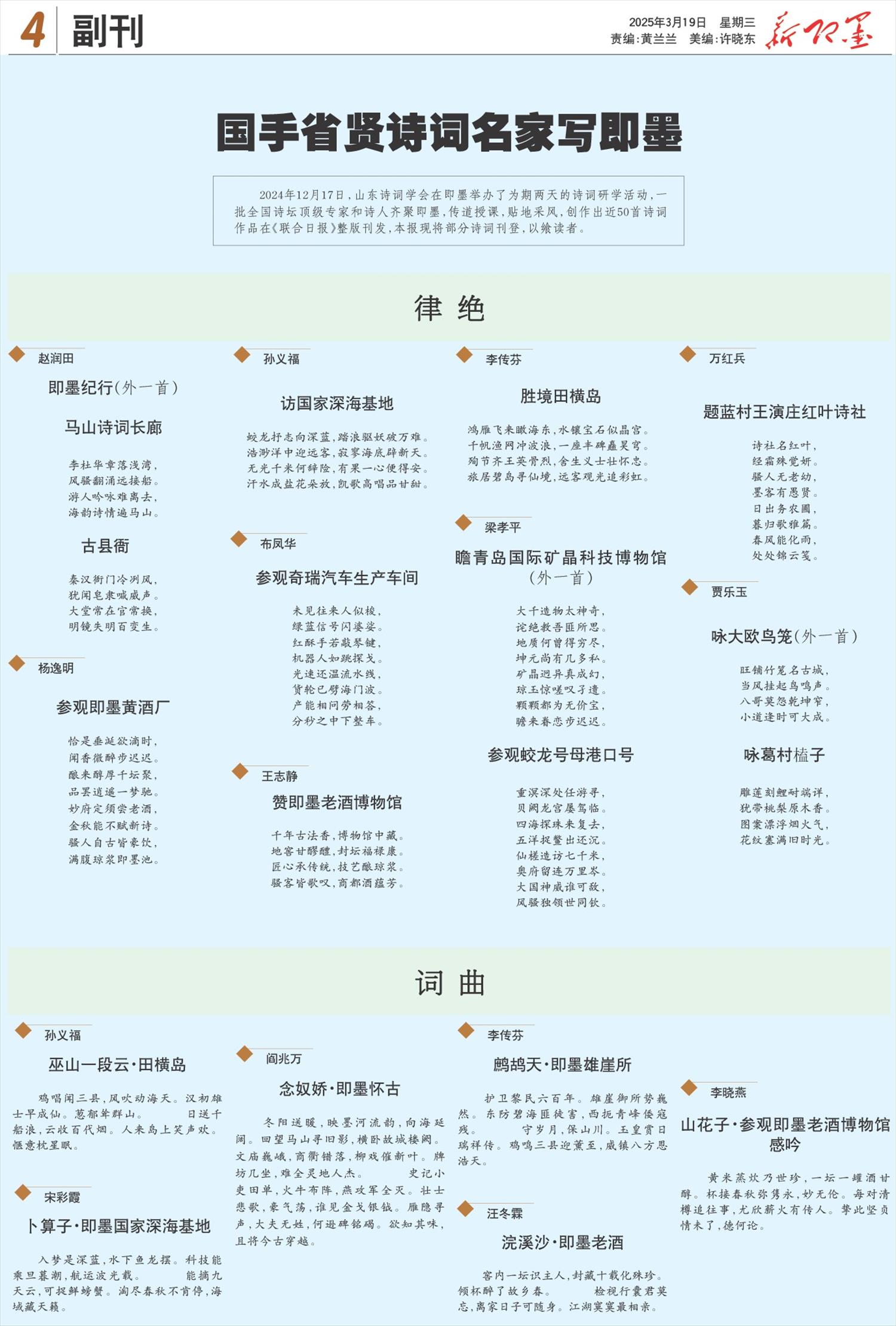 2024年12月17日,山东诗词学会在即墨举办了为期两天的诗词研学活动,一批全国诗坛顶级专家和诗人齐聚即墨,传道授课,贴地采风,创作出近50首诗词作品在《联合日报》整版刊发,本报现将部分诗词刊登,以飨读者。