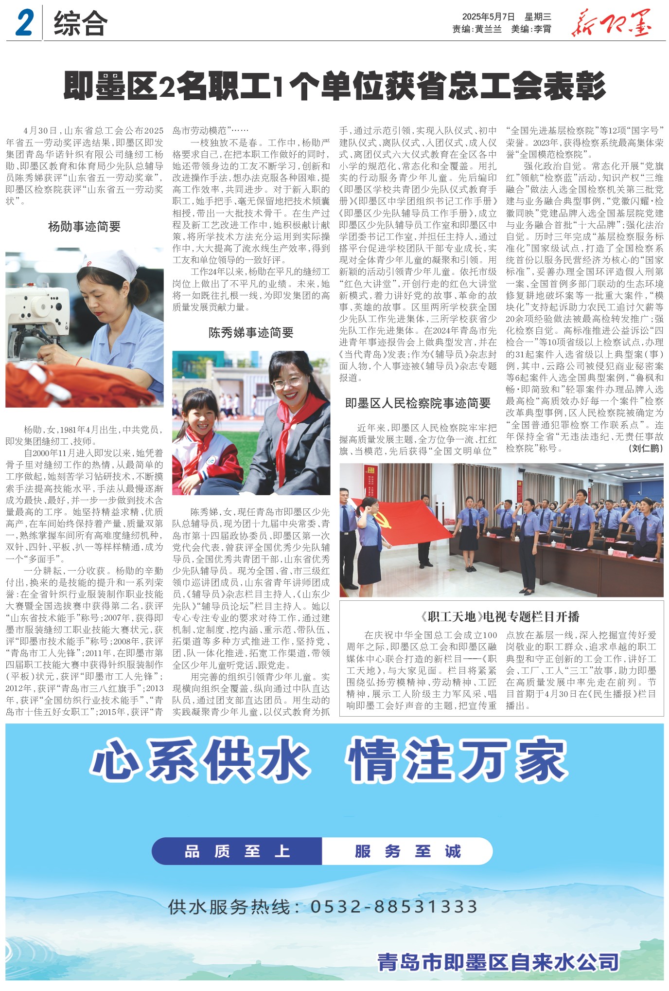 在庆祝中华全国总工会成立100周年之际,即墨区总工会和即墨区融媒体中心联合打造的新栏目——《职工天地》,与大家见面。栏目将紧紧围绕弘扬劳模精神、劳动精神、工匠精神,展示工人阶级主力军风采、唱响即墨工会好声音的主题,把宣传重点放在基层一线,深入挖掘宣传好爱岗敬业的职工群众、追求卓越的职工典型和守正创新的工会工作,讲好工会、工厂、工人“三工”故事,助力即墨在高质量发展中率先走在前列。节目首期于4月30日在《民生播报》栏目播出。