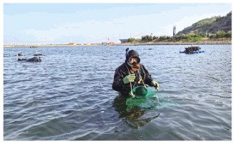 5月11日早晨7时许,笔者来到即墨田横丁字湾海域附近。距离岸边不远,是纵横交错的海参池塘。海参昼伏夜出,养殖户一般选择晚上或者清晨捕捞。