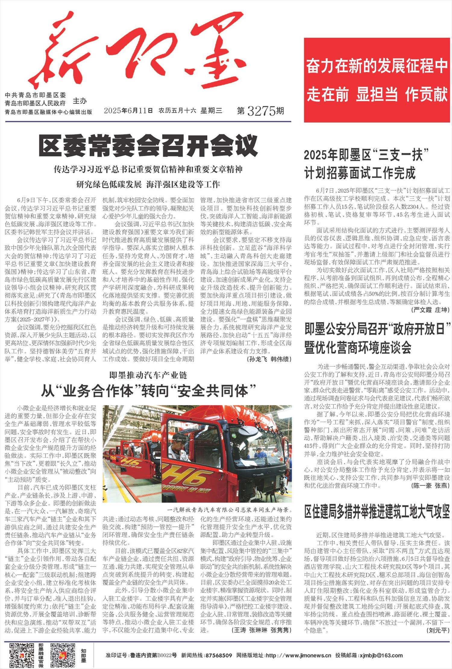 会议传达学习了习近平总书记致中国少年先锋队第九次全国代表大会的贺信精神;传达学习了习近平总书记重要文章《加快建设教育强国》精神;传达学习了山东省、青岛市绿色低碳高质量发展先行区建设领导小组会议精神,研究我区贯彻落实意见;研究了《青岛市即墨区以科技创新引领构建现代海洋产业体系培育打造海洋新质生产力行动方案(2025-2027年)》。