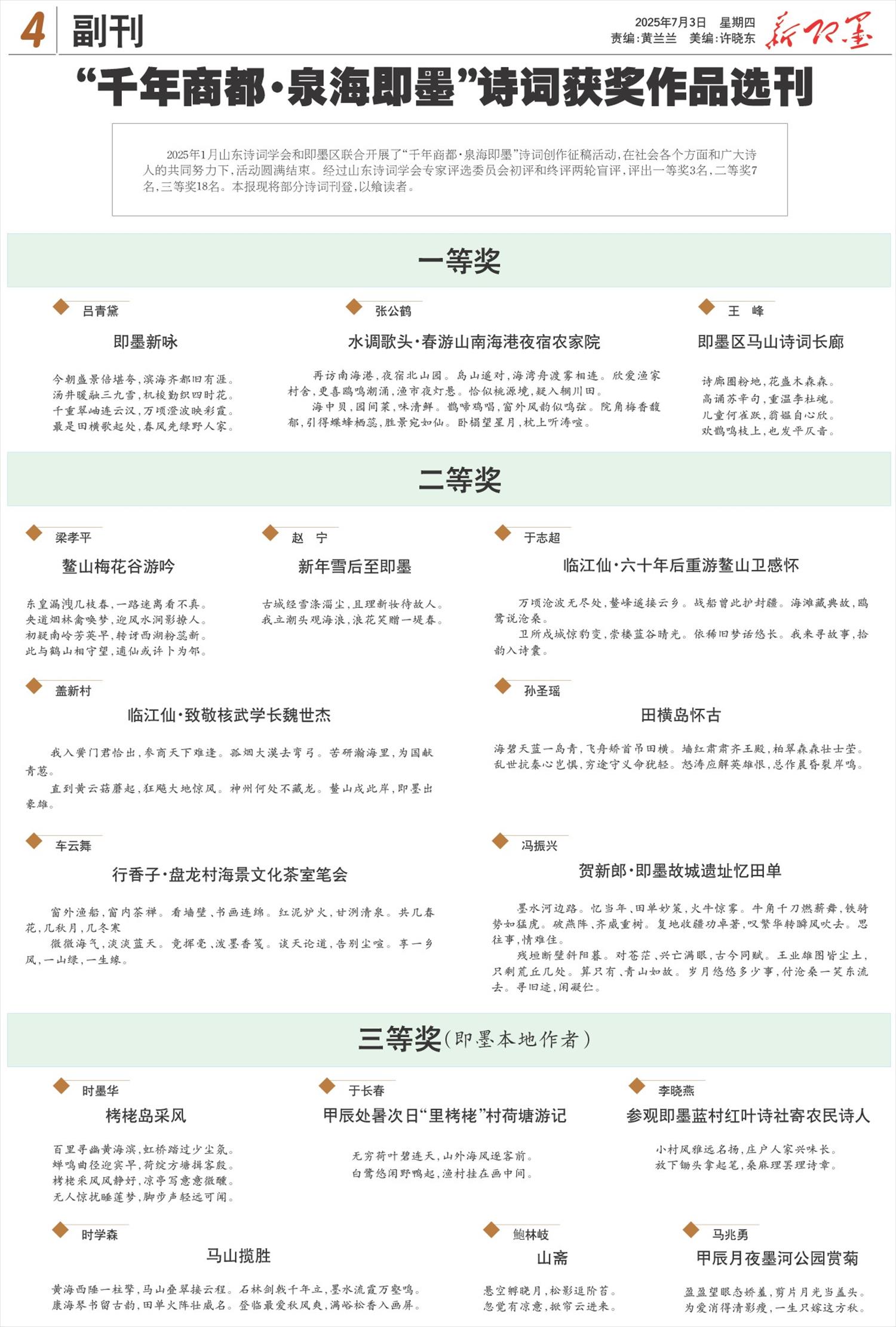 2025年1月山东诗词学会和即墨区联合开展了“千年商都·泉海即墨”诗词创作征稿活动,在社会各个方面和广大诗人的共同努力下,活动圆满结束。经过山东诗词学会专家评选委员会初评和终评两轮盲评,评出一等奖3名,二等奖7名,三等奖18名。本报现将部分诗词刊登,以飨读者。