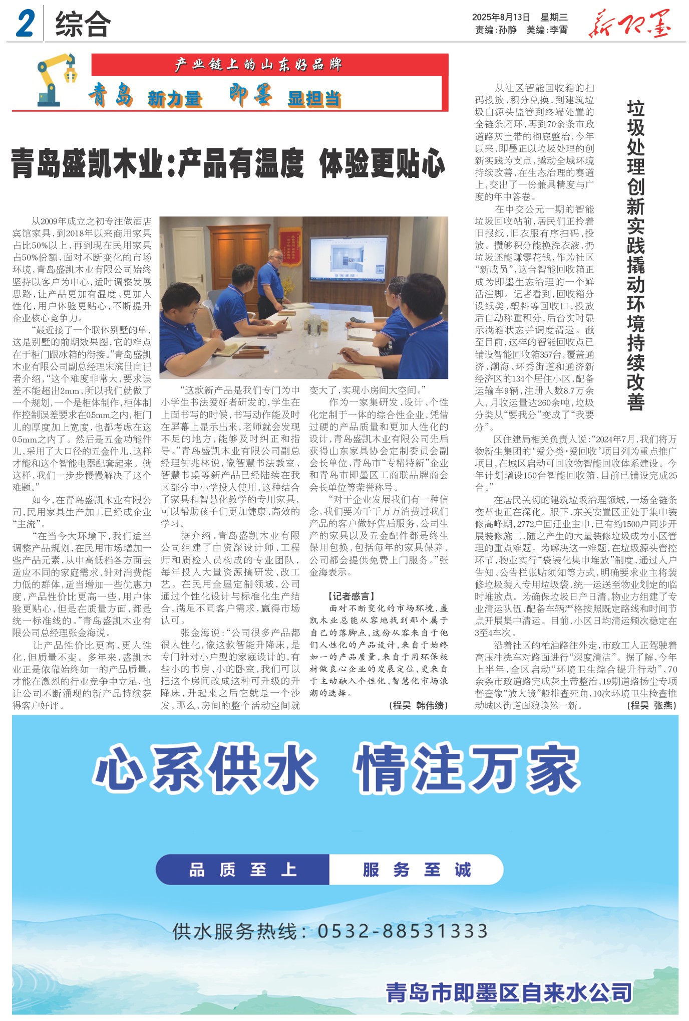 据介绍,青岛盛凯木业有限公司组建了由资深设计师、工程师和质检人员构成的专业团队,每年投入大量资源搞研发、改工艺。在民用全屋定制领域,公司通过个性化设计与标准化生产结合,满足不同客户需求,赢得市场认可。
