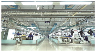 在酷特智能的服装生产车间里,悬挂在传送带上的服装配料整齐流动,每件辅料都拥有专属的二维码“身份证”,扫码即可实时获取工艺指令,实现精准加工。