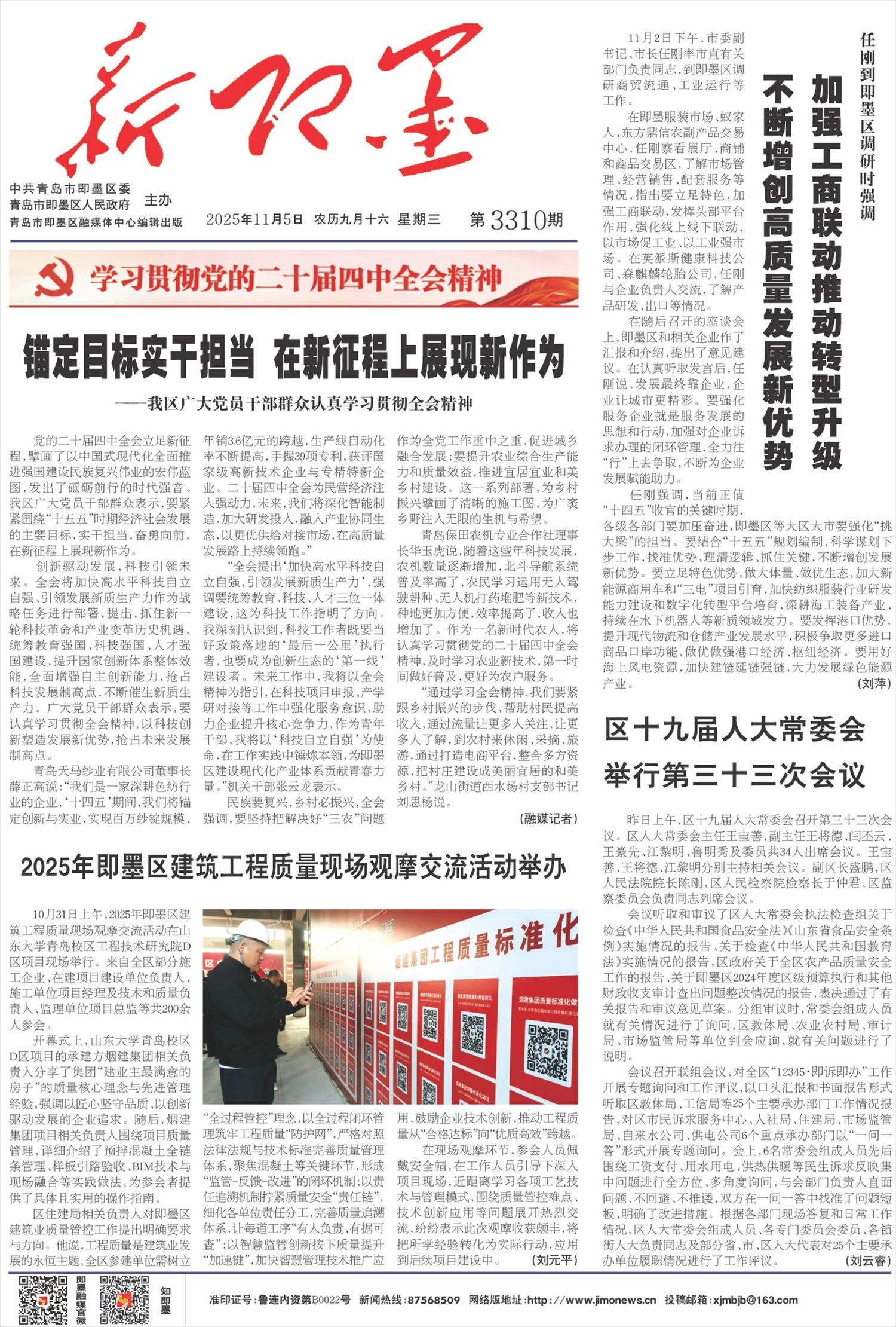任刚强调,当前正值“十四五”收官的关键时期,各级各部门要加压奋进,即墨区等大区大市要强化“挑大梁”的担当。要结合“十五五”规划编制,科学谋划下步工作,找准优势、理清逻辑、抓住关键,不断增创发展新优势。要立足特色优势,做大体量、做优生态,加大新能源商用车和“三电”项目引育,加快纺织服装行业研发能力建设和数字化转型平台培育,深耕海工装备产业、持续在水下机器人等新质领域发力。要发挥港口优势,提升现代物流和仓储产业发展水平,积极争取更多进口商品口岸功能,做优做强港口经济、枢纽经济。要用好海上风电资源,加快建链延链强链,大力发展绿色能源产业。 (刘萍)