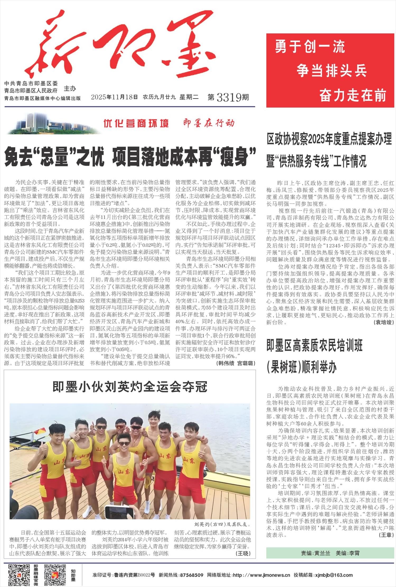 日前,在全国第十五届运动会赛艇男子八人单桨有舵手项目决赛中,即墨小伙刘英灼与队友组成的山东代表队配合默契,展示了强大的整体实力,以明显优势勇夺冠军。