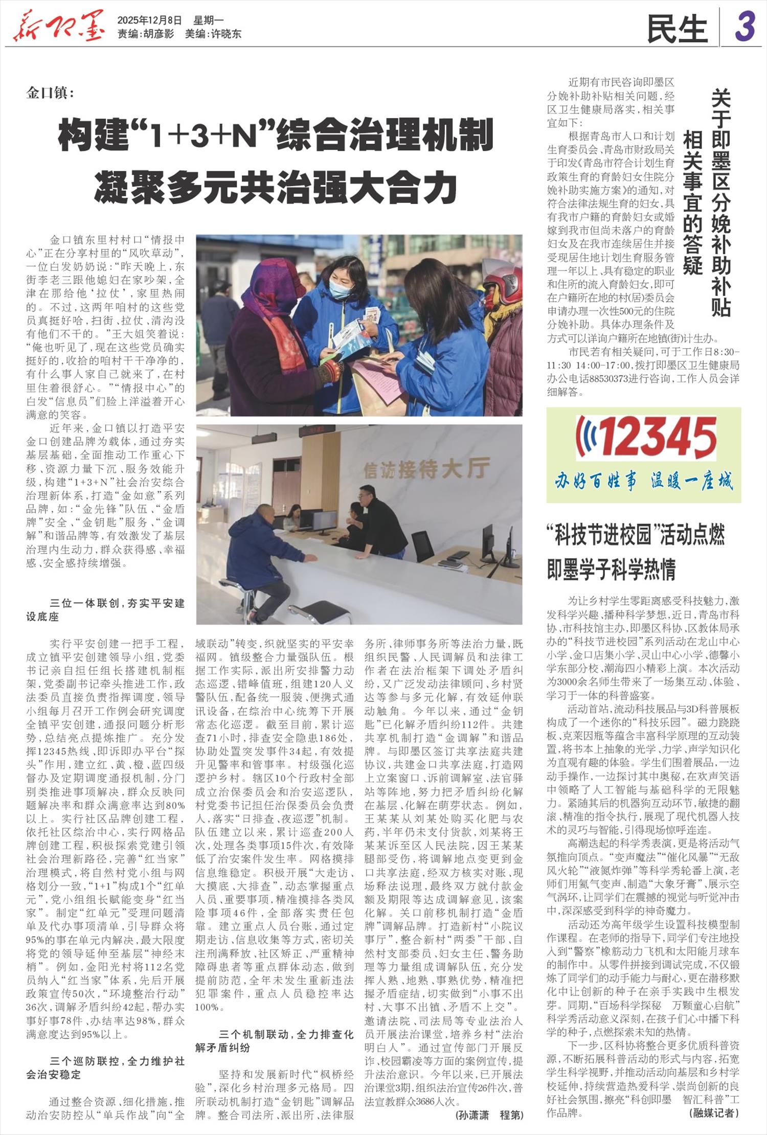 “科技节进校园”活动点燃即墨学子科学热情   为让乡村学生零距离感受科技魅力,激发科学兴趣、播种科学梦想,近日,青岛市科协、市科技馆主办,即墨区科协、区教体局承办的“科技节进校园”系列活动在龙山中心小学、金口店集小学、灵山中心小学、德馨小学东部分校、潮海四小精彩上演。本次活动为3000余名师生带来了一场集互动、体验、学习于一体的科普盛宴。