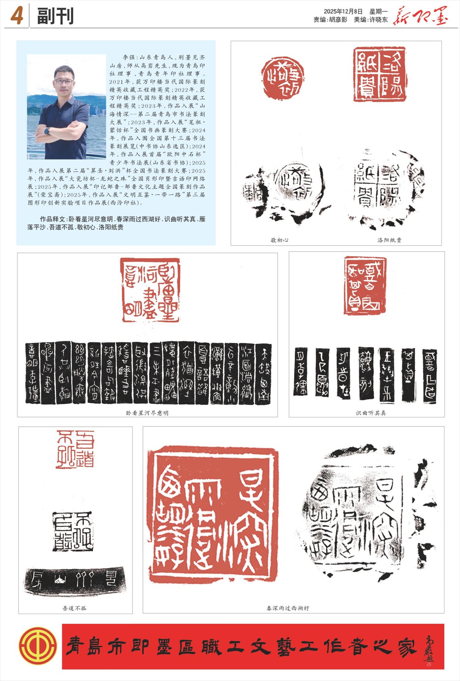 李强:山东青岛人,别署见齐山房,师从   李强:山东青岛人,别署见齐山房,师从高岩先生,现为青岛印社理事、青岛青年印社理事。2021年,获万印楼当代国际篆刻精英收藏工程精英奖;2022年,获万印楼当代国际篆刻精英收藏工程精英奖;2023年,作品入展“山海情深--第二届青岛市书法篆刻大展”;2023年,作品入展“笔祖·蒙恬杯”全国书画篆刻大赛;2024年,作品入围全国第十三届书法篆刻展览(中书协山东选区);2024年,作品入展首届“欧阳中石杯”青少年书法展(山东省书协);2025年,作品入展第二届“算圣·刘洪”杯全国书法篆刻大赛;2025年,作品入展“大瓷坊杯-龙蛇之珠”全国肖形印暨吉语印网络展;2025年,作品入展“印记邹鲁-邹鲁文化主题全国篆刻作品展”(荣宝斋);2025年,作品入展“文明互鉴·一带一路”第三届图形印创新实验项目作品展(西泠印社)。