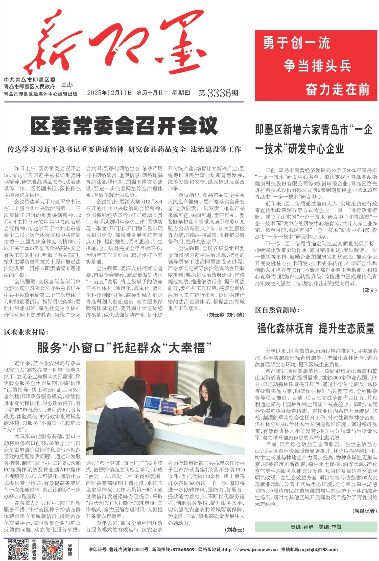会议强调,要深入贯彻落实省委、市委全会精神,高质量谋划我区“十五五”发展,将上级赋予的使命任务具体化、项目化、清单化;要强化科技创新引领,高标准融入推进青岛科创大走廊建设,全力服务保障高质量运行;要巩固壮大实体经济根基,做优做强优势产业,优化提升传统产业,培育壮大新兴产业;要统筹推进民生事业均衡普惠发展,统筹发展和安全,纵深推进反腐败斗争。