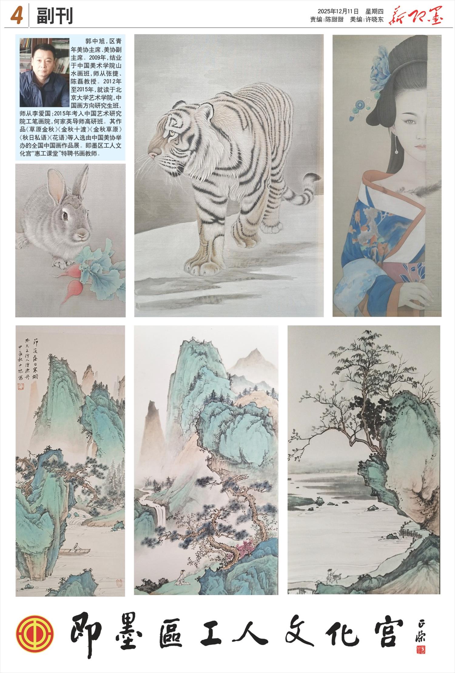 郭中旭,区青年美协主席、美协副主席。2009年,结业于中国美术学院山水画班,师从张捷、陈磊教授。2012年至2015年,就读于北京大学艺术学院,中国画方向研究生班,师从李爱国;2015年考入中国艺术研究院工笔画院,何家英导师高研班。其作品《草原金秋》《金秋十渡》《金秋草原》《秋日私语》《花语》等入选由中国美协举办的全国中国画作品展。即墨区工人文化宫“惠工课堂”特聘书画教师。