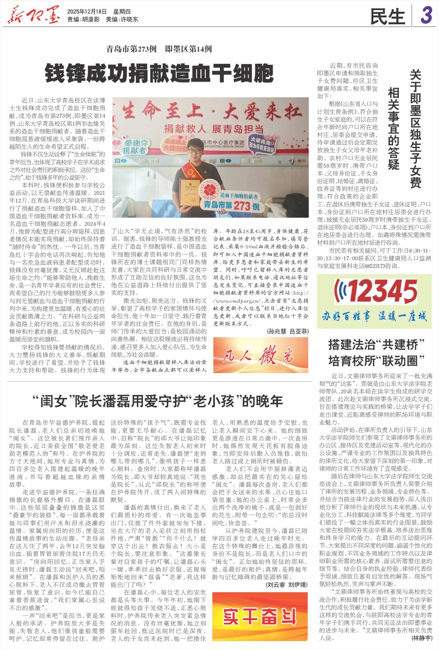 本科时,钱锋便积极参与学校公益活动,以无偿献血传递温暖。2021年12月,在青岛科技大学读研期间进行了捐献造血干细胞留样,加入了中国造血干细胞捐献者资料库,成为一名造血干细胞捐献志愿者。2024年4月,他曾为配型进行高分辨留样,因患者情况未能实现捐献,却始终保持着“随时待命”的热忱。一年以后,当青岛红十字会的电话再次响起,告知他与一名危急血液病患者配型成功时,钱锋没有丝毫犹豫,义无反顾赶赴这场生命之约:“能够帮助他人、挽救生命,是一名青年学者应有的社会责任,我希望自己的行为能够鼓励更多人参与到无偿献血与造血干细胞捐献的行列中来,为构建更加温暖、有爱心的社会贡献微薄之力。”在科研与公益两条道路上前行的他,正以务实的科研精神和朴素的善意,成为校园内一面温暖而坚定的旗帜。