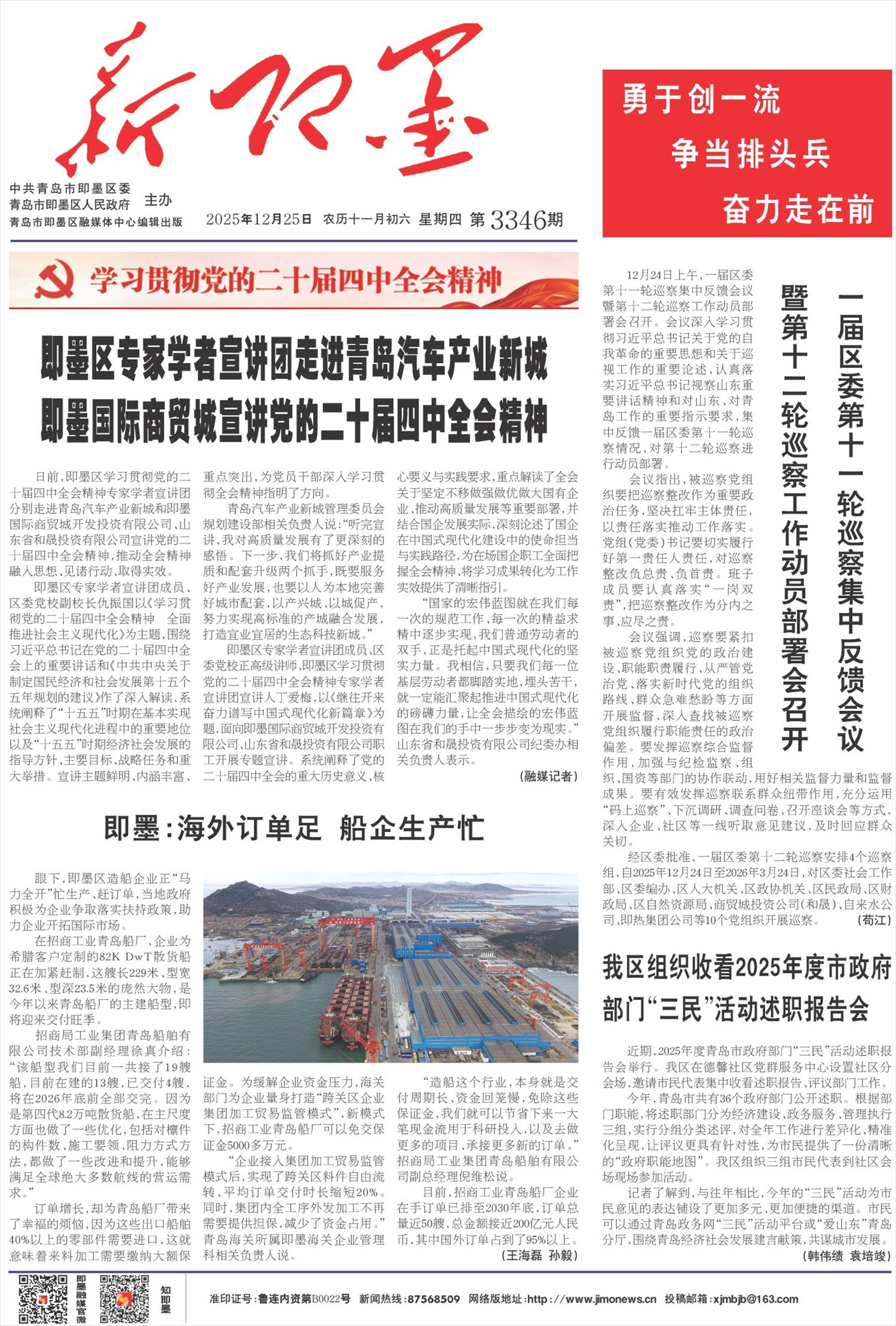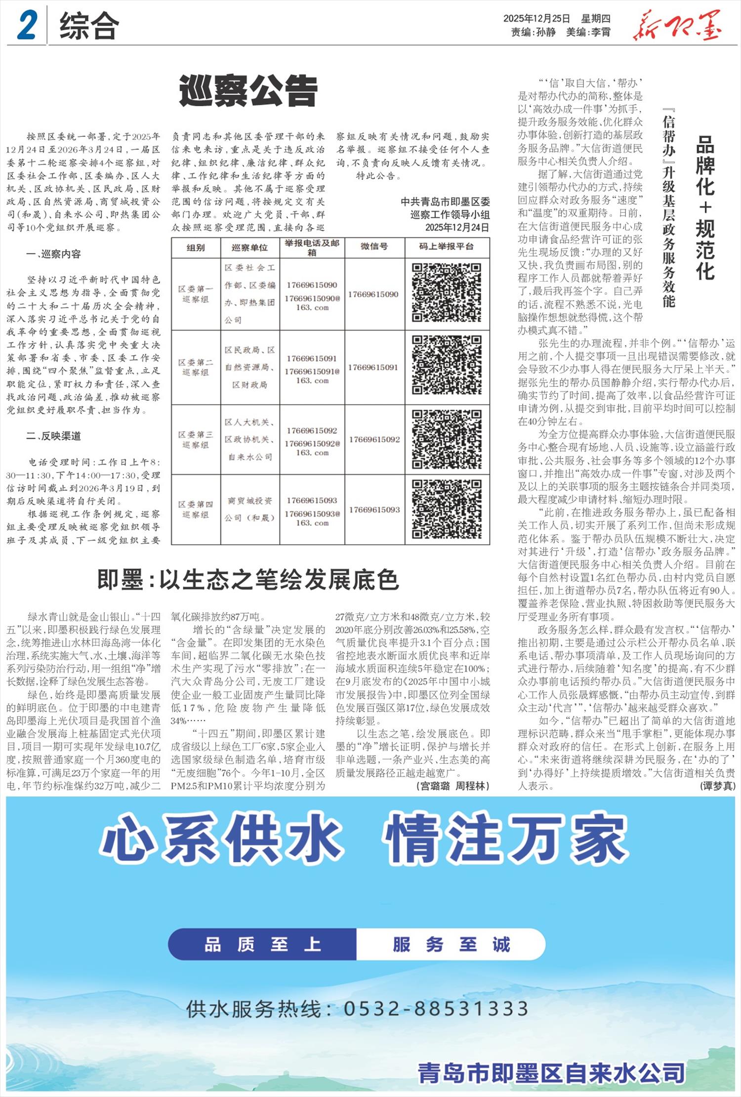 “十四五”期间,即墨区累计建成省级以上绿色工厂6家,5家企业入选国家级绿色制造名单,培育市级“无废细胞”76个。今年1-10月,全区PM2.5和PM10累计平均浓度分别为27微克/立方米和48微克/立方米,较2020年底分别改善26.03%和25.58%,空气质量优良率提升3.1个百分点;国省控地表水断面水质优良率和近岸海域水质面积连续5年稳定在100%;在9月底发布的《2025年中国中小城市发展报告》中,即墨区位列全国绿色发展百强区第17位,绿色发展成效持续彰显。